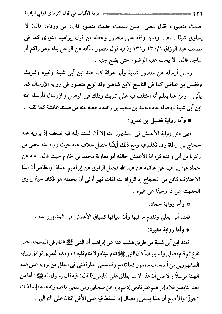 فعند ابن أبى شيبة من طريق هشيم عنه عن إبراهيم أن النبي - صلى الله عليه وسلم - "نام في المسجد حتى نفخ ثم قام فصلى ولم يتوضأ كان النبي - صلى الله عليه وسلم - تنام عيناه ولا ينام قلبه"، وهذه الطريق توافق رواية المشهورين من أصحاب منصور كما تقدم وقد سمى الدارقطني في العلل من يرويه على هذه الهيئة مرسلًا والأصل أن هذا الاسم يطلق على التابعي إذا قال: فيه قال رسول الله - صلى الله عليه وسلم -: أما من بعد التابعين فلا وإبراهيم غير تابعى إذ لم يرو عن صحابي ومن سمى ما صورته هذه فإنما ذلك تجوزًا والأصح أن هذا يسمى إعضال إذ السقط فيه على الأقل اثنان على التوالى.