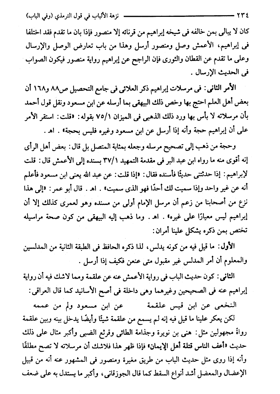 الأمر الثانى: في مرسلات إبراهيم ذكر العلائى في جامع التحصيل ص 88 و 168 أن بعض أهل العلم احتج بها وخص ذلك البيهقي بما أرسله عن ابن مسعود ونقل قول أحمد بأن مرسلاته لا بأس بها ورد ذلك الذهبى في الميزان 1/ 75 بقوله: "قلت: استقر الأمر على أن إبراهيم حجة وأنه إذا أرسل عن ابن مسعود وغيره فيس بحجة". اهـ.