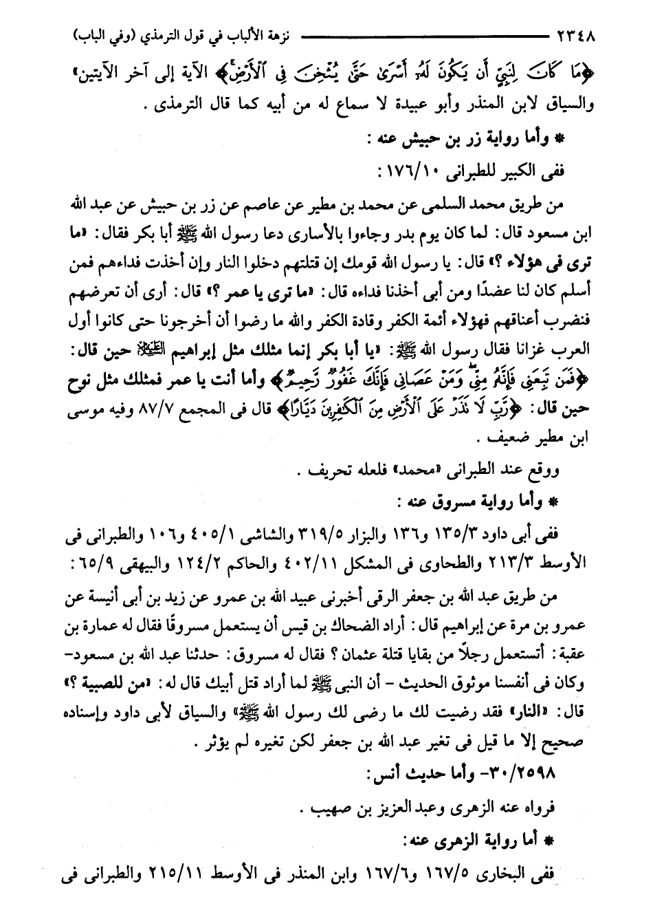 من طريق محمد السلمى عن محمد بن مطير عن عاصم عن زر بن حبيش عن عبد اللَّه ابن مسعود قال: لما كان يوم بدر وجاءوا بالأسارى دعا رسول اللَّه - صلى اللَّه عليه وسلم - أبا بكر فقال: "ما ترى في هؤلاء؟ " قال: يا رسول اللَّه قومك إن قتلتهم دخلوا النار وإن أخذت فداءهم فمن أسلم كان لنا عضدًا ومن أبي أخذنا فداءه قال: "ما ترى يا عمر؟ " قال: أرى أن تعرضهم فنضرب أعناقهم فهؤلاء أئمة الكفر وقادة الكفر واللَّه ما رضوا أن أخرجونا حتى كانوا أول العرب غزانا فقال رسول اللَّه - صلى اللَّه عليه وسلم -: "يا أبا بكر إنما مثلك مثل ابراهيم عليه السلام حين قال: {فَمَنْ تَبِعَنِي فَإِنَّهُ مِنِّي وَمَنْ عَصَانِي فَإِنَّكَ غَفُورٌ رَحِيمٌ} وأما أنت يا عمر فمثلك مثل نوح حين قال: {رَبِّ لَا تَذَرْ عَلَى الْأَرْضِ مِنَ الْكَافِرِينَ دَيَّارًا} قال في المجمع 7/ 87 وفيه موسى ابن مطير ضعيف.