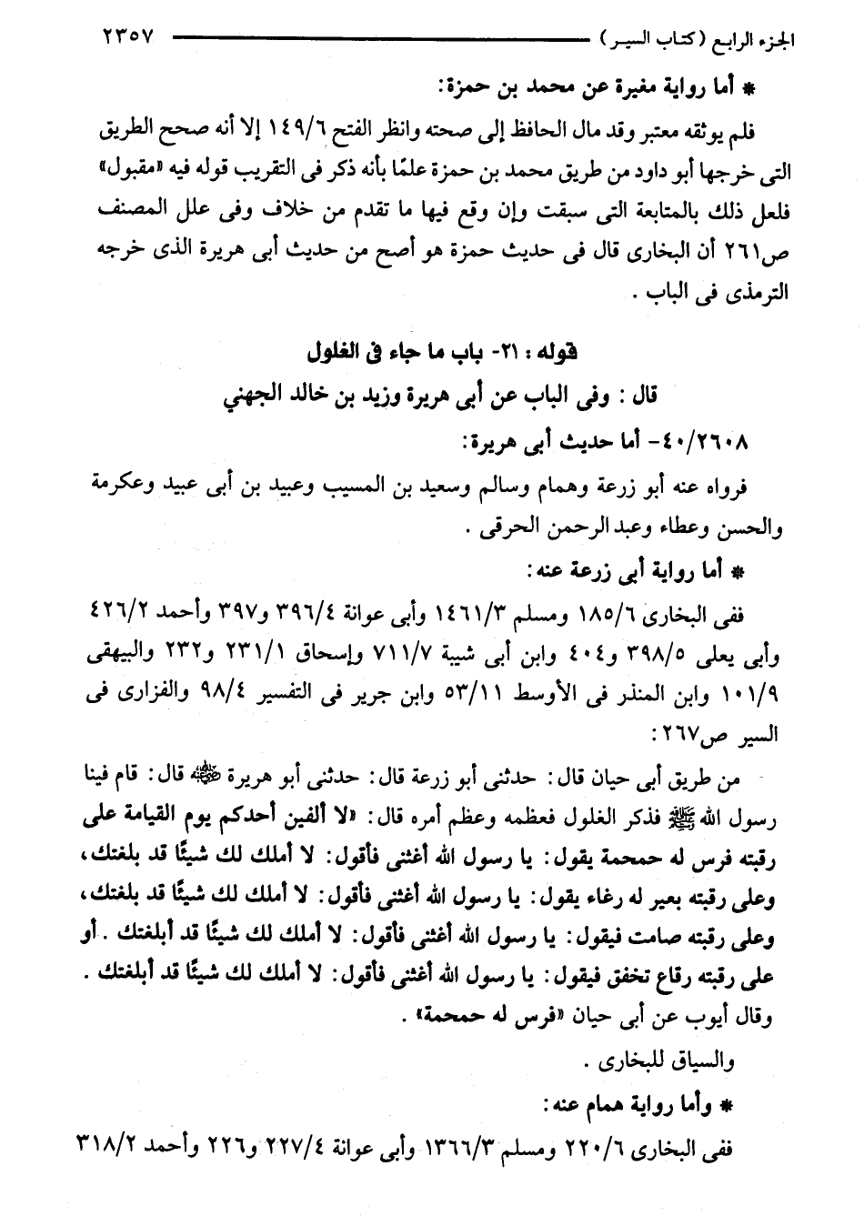 من طريق أبي حيان قال: حدثنى أبو زرعة قال: حدثنى أبو هريرة -رضي اللَّه عنه- قال: قام فينا رسول اللَّه - صلى اللَّه عليه وسلم - فذكر الغلول فعظمه وعظم أمره قال: "لا ألفين أحدكم يوم القيامة على رقبته فرس له حمحمة يقول: يا رسول اللَّه أغثنى فأقول: لا أملك لك شيئًا قد بلغتك، وعلى رقبته بعير له رغاء يقول: يا رسول اللَّه أغثنى فأقول: لا أملك لك شيئًا قد بلغتك، وعلى رقبته صامت فيقول: يا رسول اللَّه أغثنى فأقول: لا أملك لك شيئًا قد أبلغتك. أو على رقبته رقاع تخفق فيقول: يا رسول اللَّه أغثنى فأقول: لا أملك لك شيئًا قد أبلغتك. وقال أيوب عن أبي حيان "فرس له حمحمة".