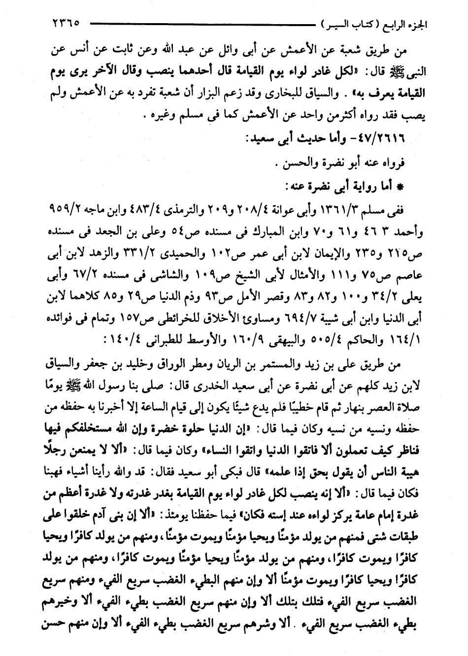 من طريق على بن زيد والمستمر بن الريان ومطر الوراق وخليد بن جعفر والسياق لابن زيد كلهم عن أبي نضرة عن أبي سعيد الخدرى قال: صلى بنا رسول اللَّه - صلى اللَّه عليه وسلم - يومًا صلاة العصر بنهار ثم قام خطيبًا فلم يدع شيئًا يكون إلى قيام الساعة إلا أخبرنا به حفظه من حفظه ونسيه من نسيه وكان فيما قال: "إن الدنيا حلوة خضرة وإن اللَّه مستخلفكم فيها فناظر كيف تعملون ألا فاتقوا الدنيا واتقوا النساء" وكان فيما قال: "ألا لا يمنعن رجلًا هيبة الناس أن يقول بحق إذا علمه" قال فبكى أبو سعيد فقال: قد واللَّه رأينا أشياء فهبنا فكان فيما قال: "ألا انه ينصب لكل غادر لواء يوم القيامة بغدر غدرته ولا غدرة أعظم من غدرة إمام عامة يركز لواءه عند إسته فكان" فيما حفظنا يومئذ: "ألا إن بنى أدم خلقوا على طبقات شتى فمنهم من يولد مؤمنًا ويحيا مؤمنًا ويموت مؤمنًا، ومنهم من يولد كافرًا ويحيا كافرًا ويموت كافرًا، ومنهم من يولد مؤمنًا ويحيا مؤمنًا ويموت كافرًا، ومنهم من يولد كافرًا ويحيا كافرًا ويموت مؤمنًا ألا وإن منهم البطيء الغضسب سريع الفيء ومنهم سريع الغضب سربع الفيء فتلك بتلك ألا وإن منهم سربع الغضب بطيء الفيء ألا وخيرهم بطيء الغضب سريع الفيء. ألا وشرهم سريع الغضب بطيء الفيء ألا وإن منهم حسن