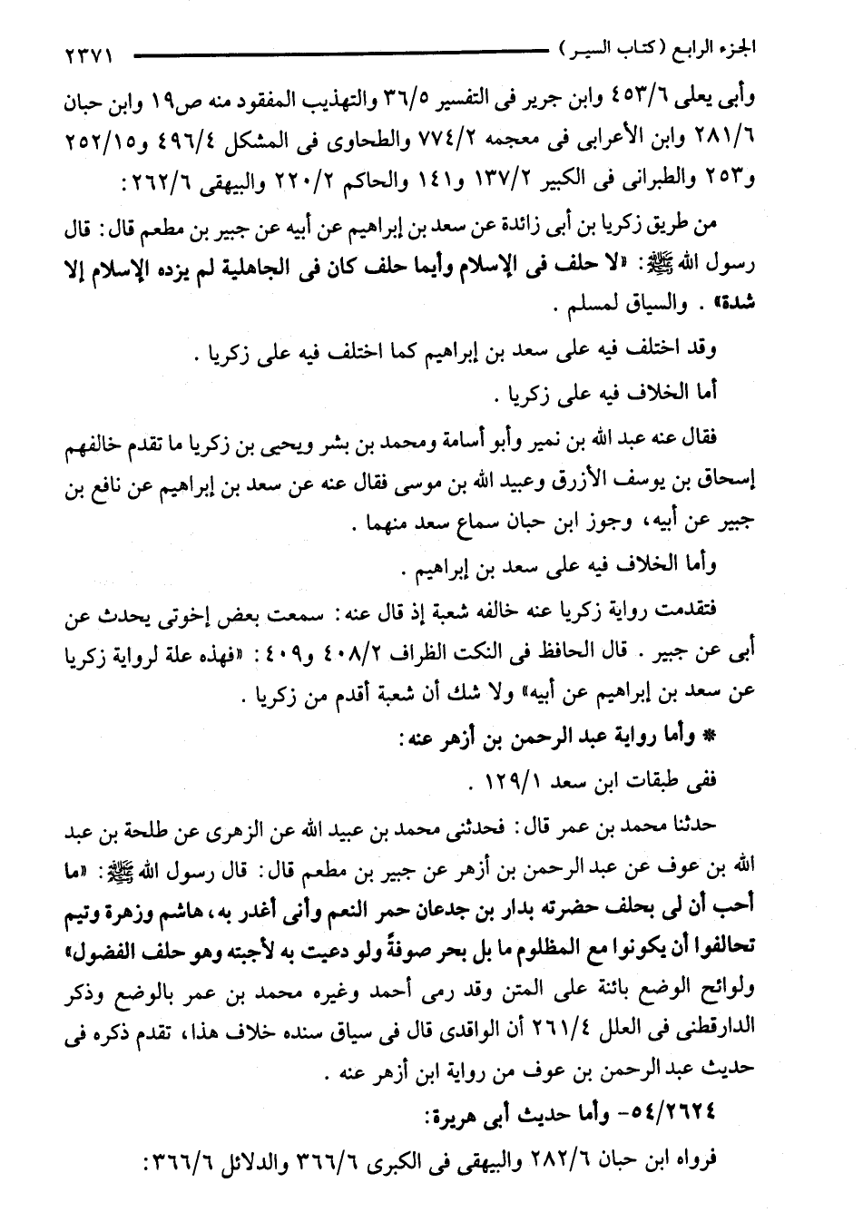 من طريق زكريا بن أبي زائدة عن سعد بن إبراهيم عن أبيه عن جبير بن مطعم قال: قال رسول اللَّه - صلى اللَّه عليه وسلم -: "لا حلف في الإسلام وأيما حلف كان في الجاهلية لم يزده الإسلام إلا شدة". والسياق لمسلم.