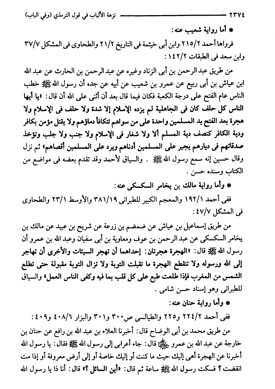 من طريق محمد بن أبي الوضاح قال: أخبرنا العلاء بن عبد اللَّه بن رافع عن حنان بن خارجة عن عبد اللَّه بن عمرو -رضي اللَّه عنه- قال: جاء أعرابى إلى رسول اللَّه - صلى اللَّه عليه وسلم - فقال: يا رسول اللَّه أخبرنا عن الهجرة أهى إليك حيث ما كنت أو إليك خاصة أو إلى أرض معروفة أو إذا مت انقضت؟ فسكت رسول اللَّه - صلى اللَّه عليه وسلم - ساعة ثم قال: "أين السائل؟ "، قال: أنا ذا يا رسول اللَّه