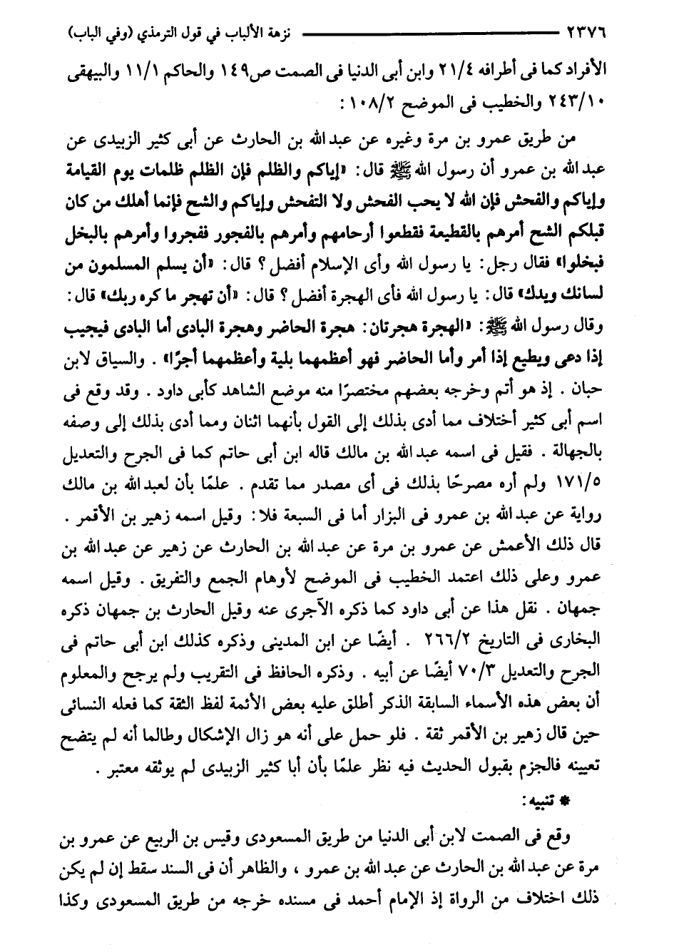 من طريق عمرو بن مرة وغيره عن عبد اللَّه بن الحارث عن أبي كثير الزبيدى عن عبد اللَّه بن عمرو أن رسول اللَّه - صلى اللَّه عليه وسلم - قال: "إياكم والظلم فإن الظلم ظلمات يوم القيامة وإياكم والفحش فإن اللَّه لا يحب الفحش ولا التفحش وإياكم والشح فإنما أهلك من كان قبلكم الشح أمرهم بالقطيعة فقطعوا أرحامهم وأمرهم بالفجور ففجروا وأمرهم بالبخل فبخلوا" فقال رجل: يا رسول اللَّه وأى الإسلام أفضل؟ قال: "أن يسلم المسلمون من لسانك ويدك" قال: يا رسول اللَّه فأى الهجرة أفضل؟ قال: "أن تهجر ما كره ربك" قال: وقال رسول اللَّه - صلى اللَّه عليه وسلم -: "الهجرة هجرتان: هجرة الحاضر وهجرة البادى أما البادى فيجيب إذا دعى ويطيع إذا أمر وأما الحاضر فهو أعظمهما بلية وأعظمهما أجرًا". والسياق لابن حبان. إذ هو أتم وخرجه بعضهم مختصرًا منه موضع الشاهد كأبى داود. وقد وقع في اسم أبي كثير أختلاف مما أدى بذلك إلى القول بأنهما اثنان ومما أدى بذلك إلى وصفه بالجهالة. فقيل في اسمه عبد اللَّه بن مالك قاله ابن أبي حاتم كما في الجرح والتعديل 5/ 171 ولم أره مصرحًا بذلك في أي مصدر مما تقدم. علمًا بأن لعبد اللَّه بن مالك رواية عن عبد اللَّه بن عمرو في البزار أما في السبعة فلا: وقيل اسمه زهير بن الأقمر. قال ذلك الأعمش عن عمرو بن مرة عن عبد اللَّه بن الحارث عن زهير عن عبد اللَّه بن عمرو وعلى ذلك اعتمد الخطيب في الموضح لأوهام الجمع والتفريق. وقيل اسمه جمهان. نقل هذا عن أبي داود كما ذكره الآجرى عنه وقيل الحارث بن جمهان ذكره البخاري في التاريخ 2/ 266. أيضا عن ابن المدينى وذكره كذلك ابن أبي حاتم في الجرح والتعديل 3/ 70 أيضا عن أبيه. وذكره الحافظ في التقريب ولم يرجح والمعلوم أن بعض هذه الأسماء السابقة الذكر أطلق عليه بعض الأئمة لفظ الثقة كما فعله النسائي حين قال زهير بن الأقمر ثقة. فلو حمل على أنه هو زال الإشكال وطالما أنه لم يتضح تعيينه فالجزم بقبول الحديث فيه نظر علمًا بأن أبا كثير الزبيدى لم يوثقه معتبر.