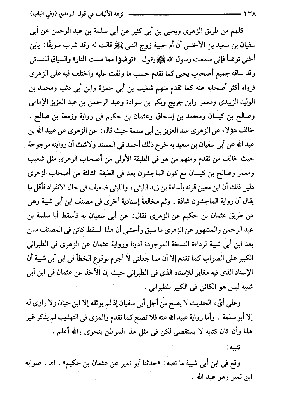 كلهم من طريق الزهرى ويحيى بن أبى كثير عن أبى سلمة بن عبد الرحمن عن أبى سفيان بن سعيد بن الأخنس أن أم حبيبة زوج النبي - صلى الله عليه وسلم - قالت له وقد شرب سويقًا: يابن أختى توضأ فإنى سمعت رسول الله - صلى الله عليه وسلم - يقول: "توضؤا مما مست النار" والسياق للنسائي وقد ساقه جميع أصحاب يحيى كما تقدم حسب ما وقفت عليه واختلف فيه على الزهرى فرواه أكثر أصحابه عنه كما تقدم منهم شعيب بن أبى حمزة وابن أبى ذئب ومحمد بن الوليد الزبيدى ومعمر وابن جريج وبكر بن سوادة وعبد الرحمن بن عبد العزيز الإمامى وصالح بن كيسان ومحمد بن إسحاق وعثمان بن حكيم في رواية وزمعة بن صالح. خالف هؤلاء عن الزهرى عبد العزيز بن أبى سلمة حيث قال: عن الزهرى عن عبيد الله بن عبد الله عن أبى سفيان بن سعيد به خرج ذلك أحمد في المسند ولا شك أن روايته مرجوحة حيث خالف من تقدم ومنهم من هو في الطبقة الأولى من أصحاب الزهرى مثل شعيب ومعمر وصالح بن كيسان مع كون الماجشون يعد في الطبقة الثالثة من أصحاب الزهرى دليل ذلك أن ابن معين قرنه بأسامة بن زيد الليثى، والليثى ضعيف في حال الانفراد فأقل ما يقال أن رواية الماجشون شاذة. وثم مخالفة إسنادية أخرى في مصنف ابن أبى شيبة وهى من طريق عثمان بن حكيم عن الزهرى فقال: عن أبى سفيان به فأسقط أبا سلمة بن عبد الرحمن والمشهور عن الزهرى ما سبق وأخشى أن هذا السقط كائن في المصنف ممن بعد ابن أبى شيبة لرداءة النسخة الموجودة لدينا ورواية عثمان عن الزهرى في الطبراني الكبير على الصواب كما تقدم إلا أن مما جعلنى لا أجزم بوقوع الخطأ في ابن أبى شيبة أن الإسناد الذى فيه مغاير للإسناد الذى في الطبراني حيث إن الآخذ عن عثمان في ابن أبى شيبة ليس هو الكائن في الكبير للطبراني.