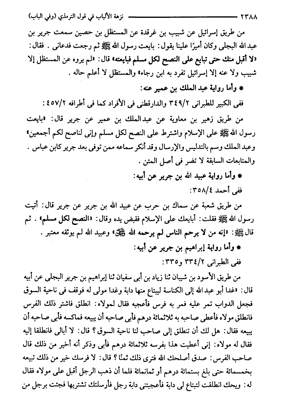 من طريق شعبة عن سماك بن حرب عن عبيد اللَّه بن جرير عن جرير قال: أتيت رسول اللَّه - صلى اللَّه عليه وسلم - فقلت: أبايعك على الإسلام فقبض يده وقال: "النصح لكل مسلم". ثم قال - صلى اللَّه عليه وسلم -: "إنه من لا يرحم الناس لم يرحمه اللَّه -عز وجل-" وعبيد اللَّه لم يوثقه معتبر.