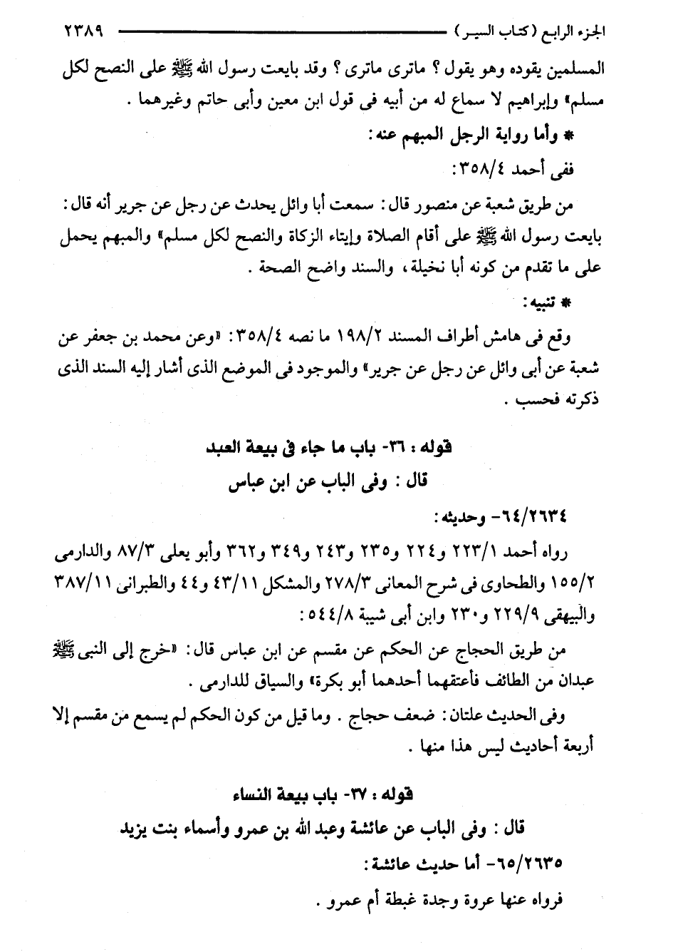 من طريق شعبة عن منصور قال: سمعت أبا وائل يحدث عن رجل عن جرير أنه قال: بايعت رسول اللَّه - صلى اللَّه عليه وسلم - على أقام الصلاة وإيتاء الزكاة والنصح لكل مسلم" والمبهم يحمل على ما تقدم من كونه أبا نخيلة، والسند واضح الصحة.