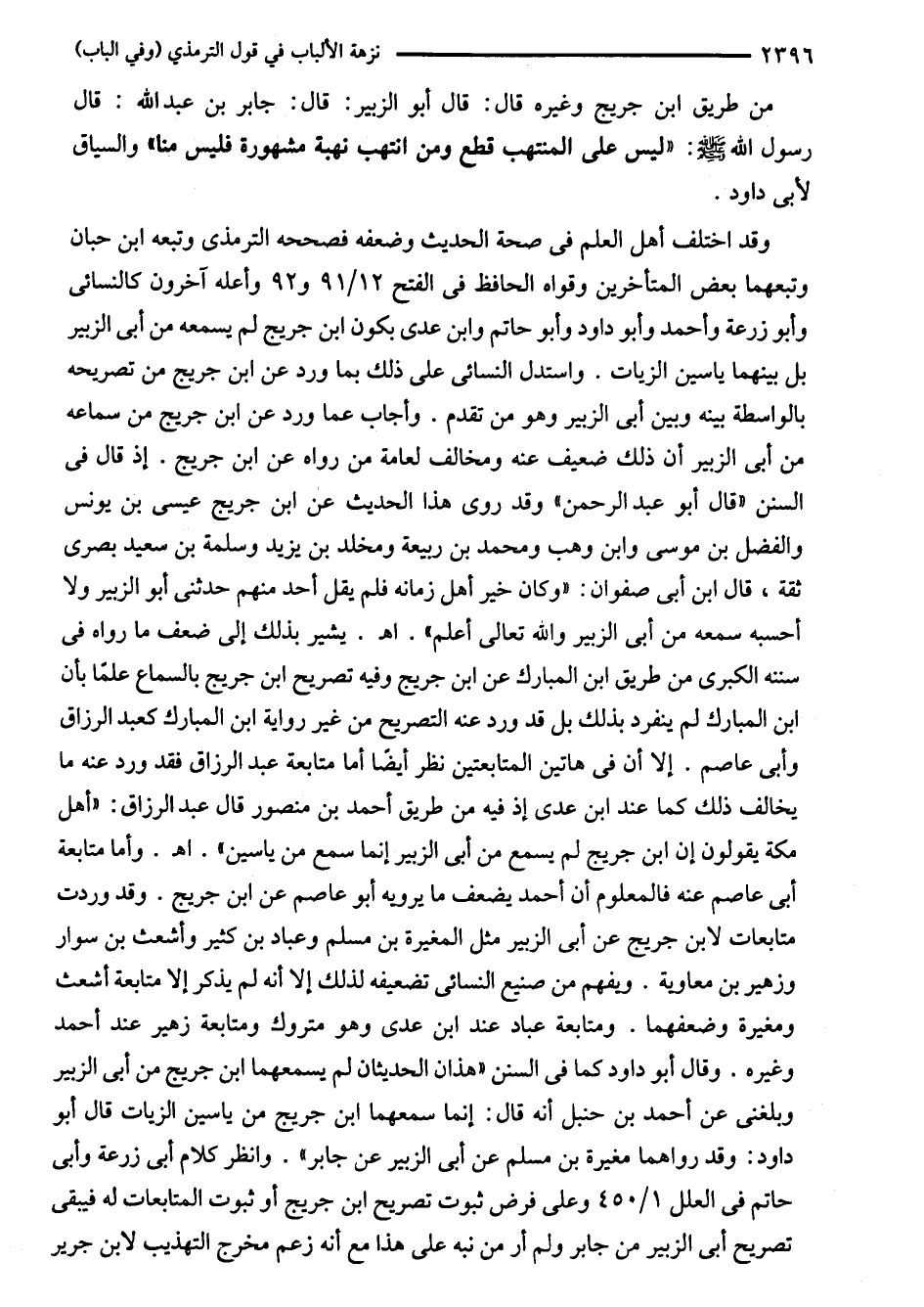 وقد اختلف أهل العلم في صحة الحديث وضعفه فصححه الترمذي وتبعه ابن حبان وتبعهما بعض المتأخرين وقواه الحافظ في الفتح 12/ 91 و 92 وأعله آخرون كالنسائي وأبو زرعة وأحمد وأبو داود وأبو حاتم وابن عدى بكون ابن جريج لم يسمعه من أبي الزبير بل بينهما ياسين الزيات. واستدل النسائي على ذلك بما ورد عن ابن جريج من تصريحه بالواسطة بينه وبين أبي الزبير وهو من تقدم. وأجاب عما ورد عن ابن جريج من سماعه من أبي الزبير أن ذلك ضعيف عنه ومخالف لعامة من رواه عن ابن جريج. إذ قال في السنن "قال أبو عبد الرحمن" وقد روى هذا الحديث عن ابن جريج عيسى بن يونس والفضل بن موسى وابن وهب ومحمد بن ربيعة ومخلد بن يزيد وسلمة بن سعيد بصرى ثقة، قال ابن أبي صفوان: "وكان خير أهل زمانه فلم يقل أحد منهم حدثنى أبو الزبير ولا أحسبه سمعه من أبي الزبير واللَّه تعالى أعلم". اهـ. يشير بذلك إلى ضعف ما رواه في سننه الكبرى من طريق ابن المبارك عن ابن جريج وفيه تصريح ابن جريج بالسماع علمًا بأن ابن المبارك لم ينفرد بذلك بل قد ورد عنه التصريح من غير رواية ابن المبارك كعبد الرزاق وأبي عاصم. إلا أن في هاتين المتابعتين نظر أيضًا أما متابعة عبد الرزاق فقد ورد عنه ما يخالف ذلك كما عند ابن عدى إذ فيه من طريق أحمد بن منصور قال عبد الرزاق: "أهل مكة يقولون إن ابن جريج لم يسمع من أبي الزبير إنما سمع من ياسين". اهـ. وأما متابعة أبي عاصم عنه فالمعلوم أن أحمد يضعف ما يرويه أبو عاصم عن ابن جريج. وقد وردت متابعات لابن جريج عن أبي الزبير مثل المغيرة بن مسلم وعباد بن كثير وأشعث بن سوار وزهير بن معاوية. ويفهم من صنيع النسائي تضعيفه لذلك إلا أنه لم يذكر إلا متابعة أشعث ومغيرة وضعفهما. ومتابعة عباد عند ابن عدى وهو متروك ومتابعة زهير عند أحمد وغيره. وقال أبو داود كما في السنن "هذان الحديثان لم يسمعهما ابن جريج من أبي الزبير وبلغنى عن أحمد بن حنبل أنه قال: إنما سمعهما ابن جريج من ياسين الزيات قال أبو داود: وقد رواهما مغيرة بن مسلم عن أبي الزبير عن جابر". وانظر كلام أبي زرعة وأبي حاتم في العلل 1/ 450 وعلى فرض ثبوت تصريح ابن جريج أو ثبوت المتابعات له فيبقى تصريح أبي الزبير من جابر ولم أر من نبه على هذا مع أنه زعم مخرج التهذيب لابن جرير