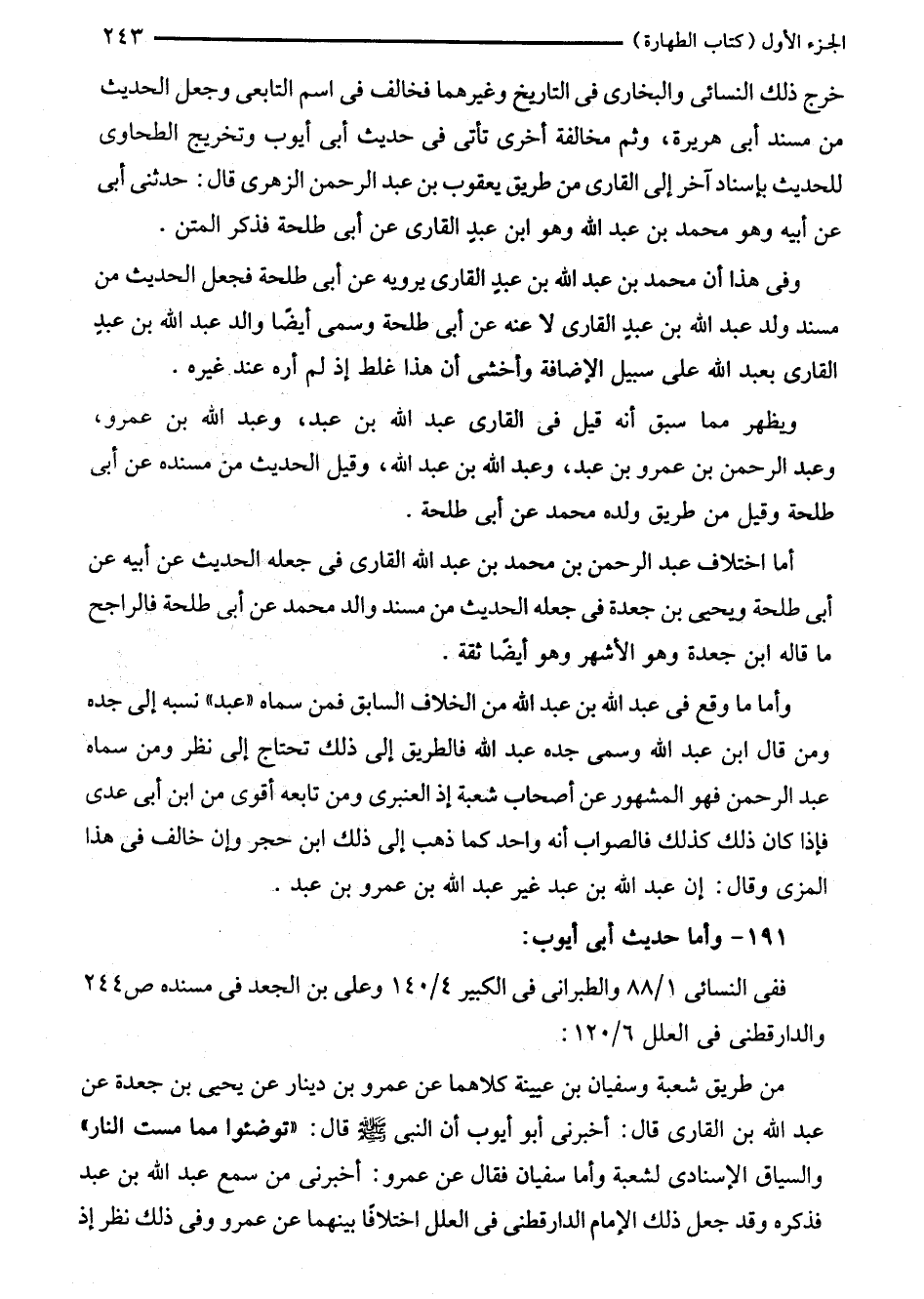 من طريق شعبة وسفيان بن عيينة كلاهما عن عمرو بن دينار عن يحيى بن جعدة عن عبد الله بن القارى قال: أخبرنى أبو أيوب أن النبي - صلى الله عليه وسلم - قال: "توضئوا مما مست النار" والسياق الإسنادى لشعبة وأما سفيان فقال عن عمرو: أخبرنى من سمع عبد الله بن عبد فذكره وقد جعل ذلك الإمام الدارقطني في العلل اختلافًا بينهما عن عمرو وفى ذلك نظر إذ