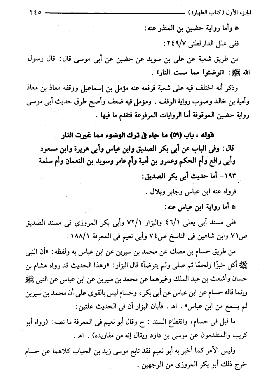 من طريق حسام بن مصك عن محمد بن سيرين عن ابن عباس به ولفظه: "أن النبي - صلى الله عليه وسلم - أكل خبزًا ولحمًا ثم صلى ولم يتوضأ" قال البزار: "وهذا الحديث قد رواه هشام بن حسان وأشعث بن عبد الملك وغيرهما عن محمد بن سيرين عن ابن عباس عن النبي - صلى الله عليه وسلم - وإنما قاله حسام عن ابن عباس عن أبى بكر، وحسام ليس بالقوى على أن محمد بن سيرين لم يسمع من ابن عباس". اهـ. فأبان البزار أن في الحديث علتين: