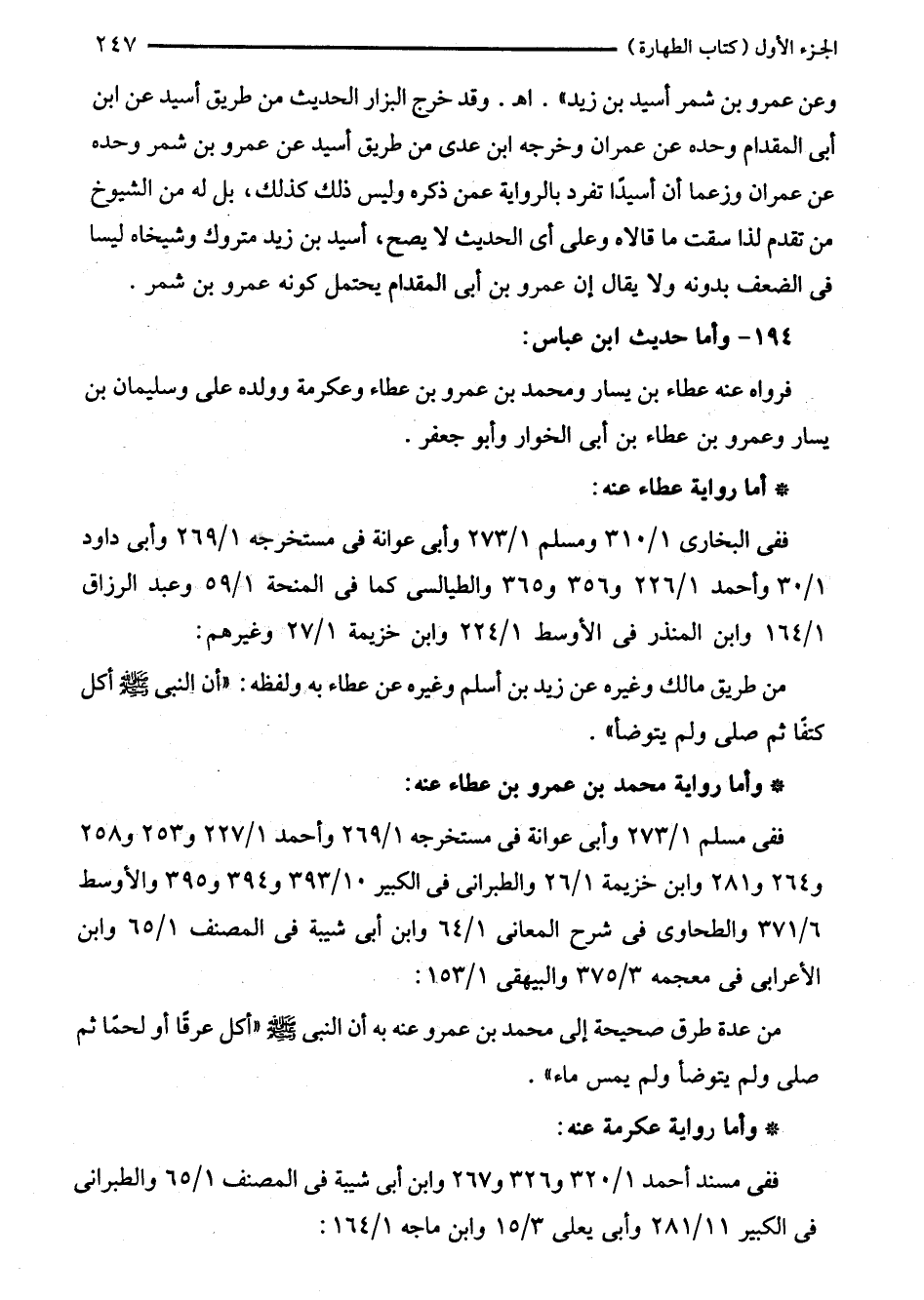ففي البخاري 1/ 310 ومسلم 1/ 273 وأبى عوانة في مستخرجه 1/ 269 وأبى داود 1/ 30 وأحمد 1/ 226 و 356 و 365 والطيالسى كما في المنحة 1/ 59 وعبد الرزاق 1/ 164 وابن المنذر في الأوسط 1/ 224 وابن خزيمة 1/ 27 وغيرهم: