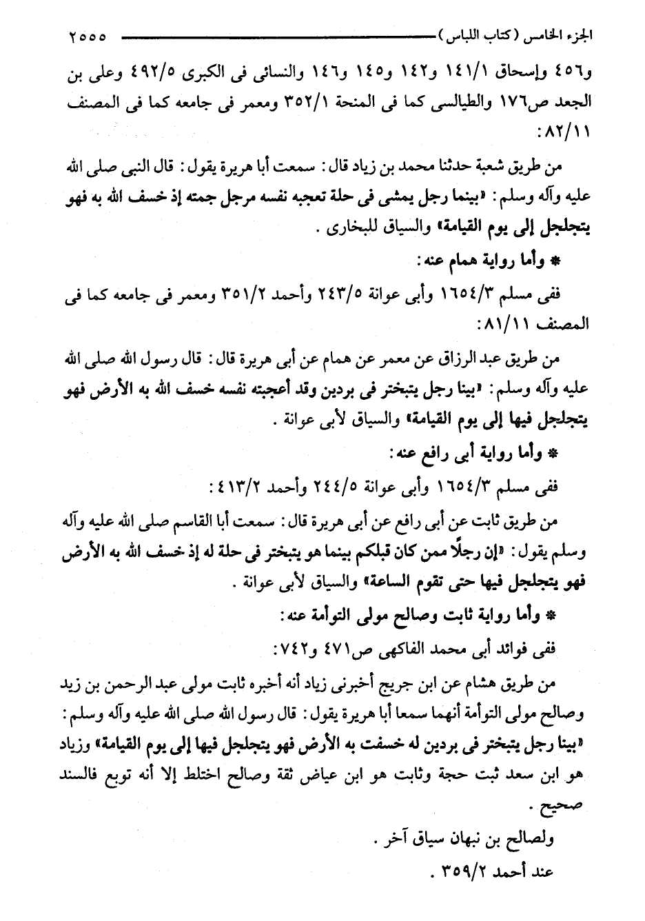 من طريق هشام عن ابن جريج أخبرنى زياد أنه أخبره ثابت مولى عبد الرحمن بن زيد وصالح مولى التوأمة أنهما سمعا أبا هريرة يقول: قال رسول اللَّه صلى اللَّه عليه وآله وسلم: "بينا رجل يتبختر في بردين له خسفت به الأرض فهو بتجلجل فيها إلى يوم القيامة" وزياد هو ابن سعد ثبت حجة وثابت هو ابن عياض ثقة وصالح اختلط إلا أنه توبع فالسند صحيح.