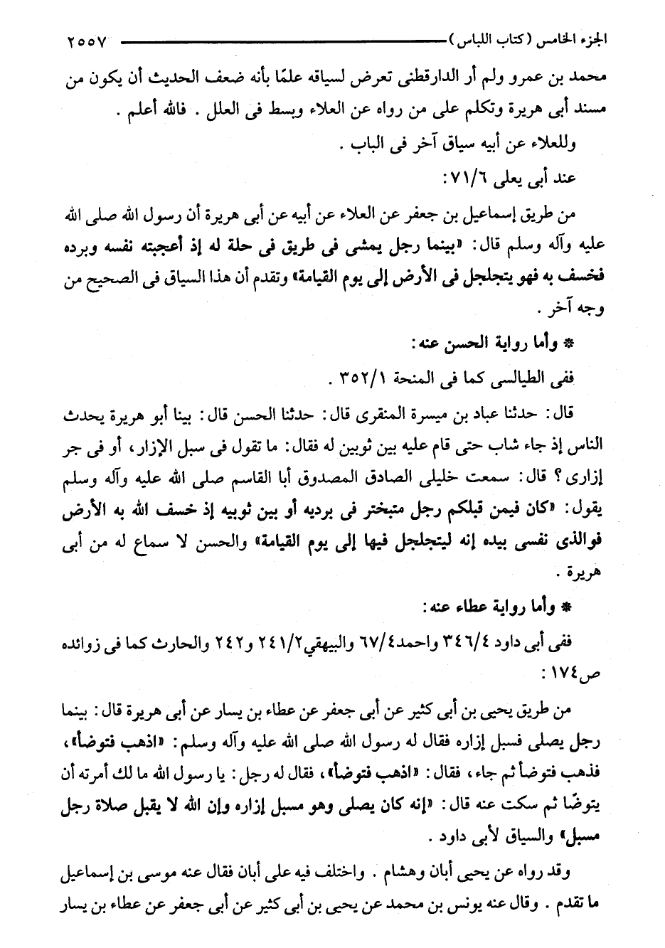 من طريق يحيى بن أبي كثير عن أبي جعفر عن عطاء بن يسار عن أبي هريرة قال: بينما رجل يصلى فسبل إزاره فقال له رسول اللَّه صلى اللَّه عليه وآله وسلم: "اذهب فتوضأ"، فذهب فتوضأ ثم جاء، فقال: "اذهب فتوضأ"، فقال له رجل: يا رسول اللَّه ما لك أمرته أن يتوضّأ ثم سكت عنه قال: "إنه كان يصلى وهو مسبل إزاره وإن اللَّه لا يقبل صلاة رجل مسبل" والسياق لأبى داود.