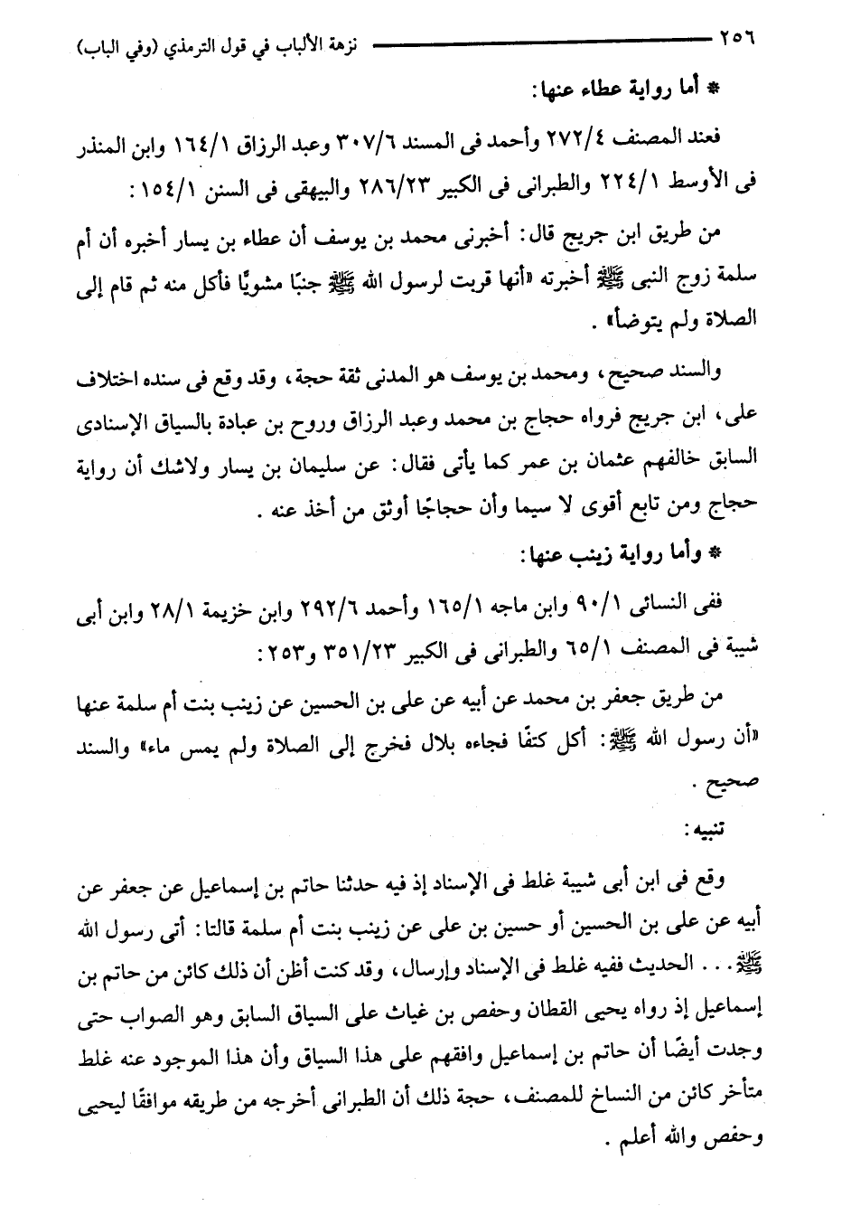 وقع في ابن أبى شيبة غلط في الإسناد إذ فيه حدثنا حاتم بن إسماعيل عن جعفر عن أبيه عن على بن الحسين أو حسين بن على عن زينب بنت أم سلمة قالتا: أتى رسول الله صلى الله عليه وسلم. . . الحديث ففيه غلط في الإسناد وإرسال، وقد كنت أظن أن ذلك كائن من حاتم بن إسماعيل إذ رواه يحيى القطان وحفص بن غياث على السياق السابق وهو الصواب حتى وجدت أيضًا أن حاتم بن إسماعيل وافقهم على هذا السياق وأن هذا الموجود عنه غلط متأخر كائن من النساخ للمصنف، حجة ذلك أن الطبراني أخرجه من طريقه موافقًا ليحيى وحفص والله أعلم.