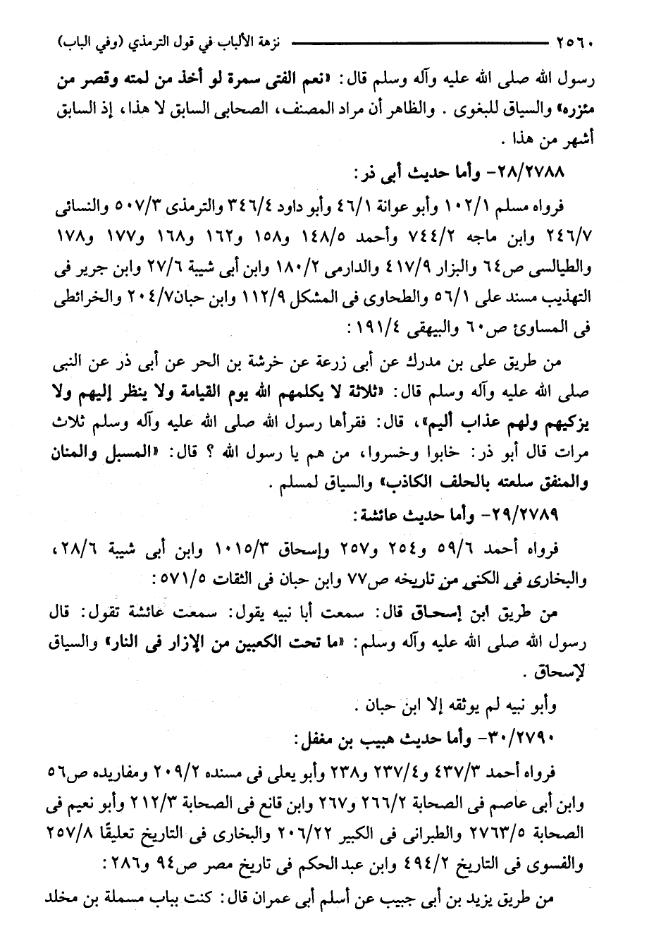 من طريق على بن مدرك عن أبي زرعة عن خرشة بن الحر عن أبي ذر عن النبي صلى اللَّه عليه وآله وسلم قال: "ثلاثة لا يكلمهم اللَّه يوم القيامة ولا ينظر إليهم ولا يزكيهم ولهم عذاب أليم"، قال: فقرأها رسول اللَّه صلى اللَّه عليه وآله وسلم ثلاث مرات قال أبو ذر: خابوا وخسروا، من هم يا رسول اللَّه؟ قال: "المسبل والمنان والمنفق سلعته بالحلف الكاذب" والسياق لمسلم.
