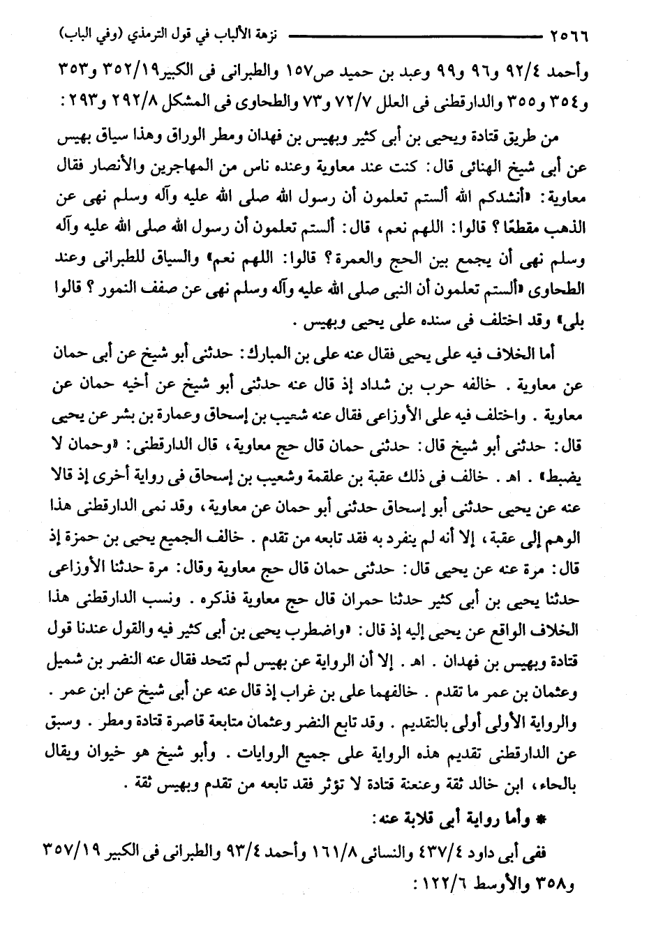 أما الخلاف فيه على يحيى فقال عنه على بن المبارك: حدثنى أبو شيخ عن أبي حمان عن معاوية. خالفه حرب بن شداد إذ قال عنه حدثنى أبو شيخ عن أخيه حمان عن معاوية. واختلف فيه على الأوزاعى فقال عنه شعيب بن إسحاق وعمارة بن بشر عن يحيى قال: حدثنى أبو شيخ قال: حدثنى حمان قال حج معاوية، قال الدارقطني: "وحمان لا يضبط". اهـ. خالف في ذلك عقبة بن علقمة وشعيب بن إسحاق في رواية أخرى إذ قالا عنه عن يحيى حدثنى أبو إسحاق حدثنى أبو حمان عن معاوية، وقد نمى الدارقطني هذا الوهم إلى عقبة، إلا أنه لم ينفرد به فقد تابعه من تقدم. خالف الجميع يحيى بن حمزة إذ قال: مرة عنه عن يحيى قال: حدثنى حمان قال حج معاوية وقال: مرة حدثنا الأوزاعى حدثنا يحيى بن أبي كثير حدثنا حمران قال حج معاوية فذكره. ونسب الدارقطني هذا الخلاف الواقع عن يحيى إليه إذ قال: "واضطرب يحيى بن أبي كثير فيه والقول عندنا قول قتادة وبهيس بن فهدان. اهـ. إلا أن الرواية عن بهيس لم تتحد فقال عنه النضر بن شميل وعثمان بن عمر ما تقدم. خالفهما على بن غراب إذ قال عنه عن أبي شيخ عن ابن عمر. والرواية الأولى أولى بالتقديم. وقد تابع النضر وعثمان متابعة قاصرة قتادة ومطر. وسبق عن الدارقطني تقديم هذه الرواية على جميع الروايات. وأبو شيخ هو خيوان ويقال بالحاء، ابن خالد ثقة وعنعنة قتادة لا تؤثر فقد تابعه من تقدم وبهيس ثقة.