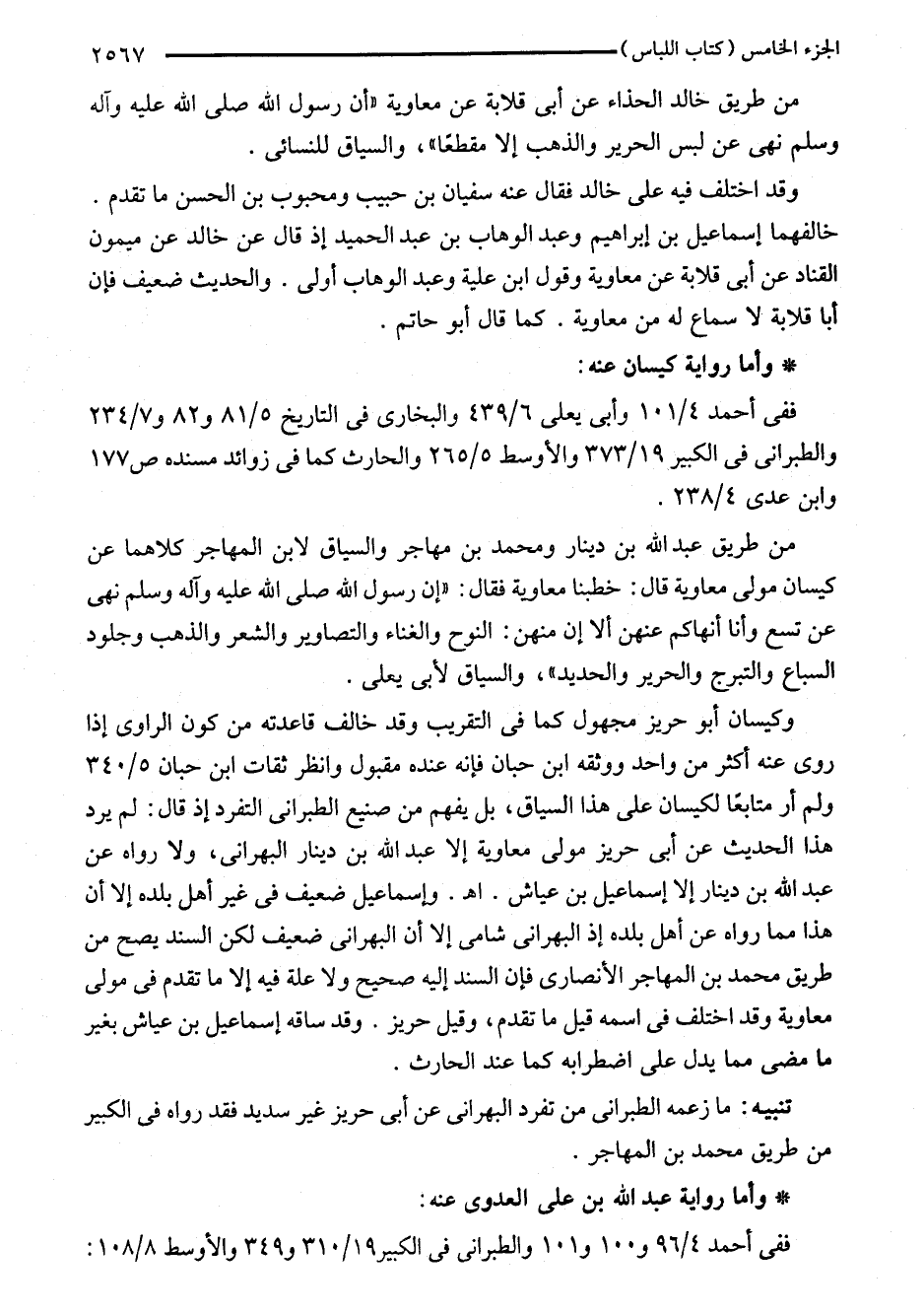 من طريق عبد اللَّه بن دينار ومحمد بن مهاجر والسياق لابن المهاجر كلاهما عن كيسان مولى معاوية قال: خطبنا معاوية فقال: "إن رسول اللَّه صلى اللَّه عليه وآله وسلم نهى عن تسع وأنا أنهاكم عنهن ألا إن منهن: النوح والغناء والتصاوير والشعر والذهب وجلود السباع والتبرج والحرير والحديد"، والسياق لأبى يعلى.