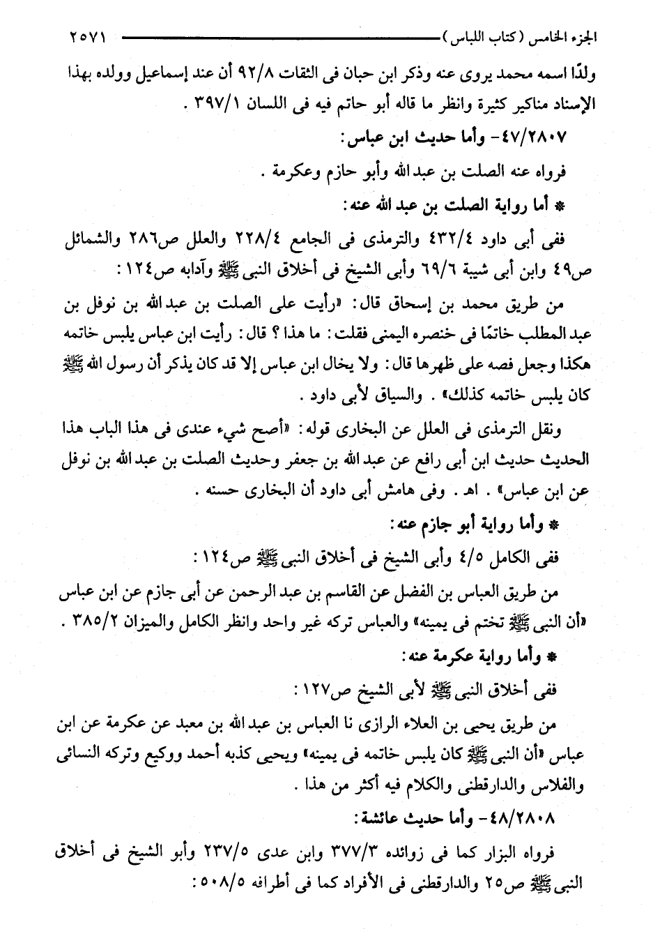 من طريق محمد بن إسحاق قال: "رأيت على الصلت بن عبد اللَّه بن نوفل بن عبد المطلب خاتمًا في خنصره اليمنى فقلت: ما هذا؟ قال: رأيت ابن عباس يلبس خاتمه هكذا وجعل فصه على ظهرها قال: ولا يخال ابن عباس إلا قد كان يذكر أن رسول اللَّه - صلى اللَّه عليه وسلم - كان يلبس خاتمه كذلك". والسياق لأبى داود.