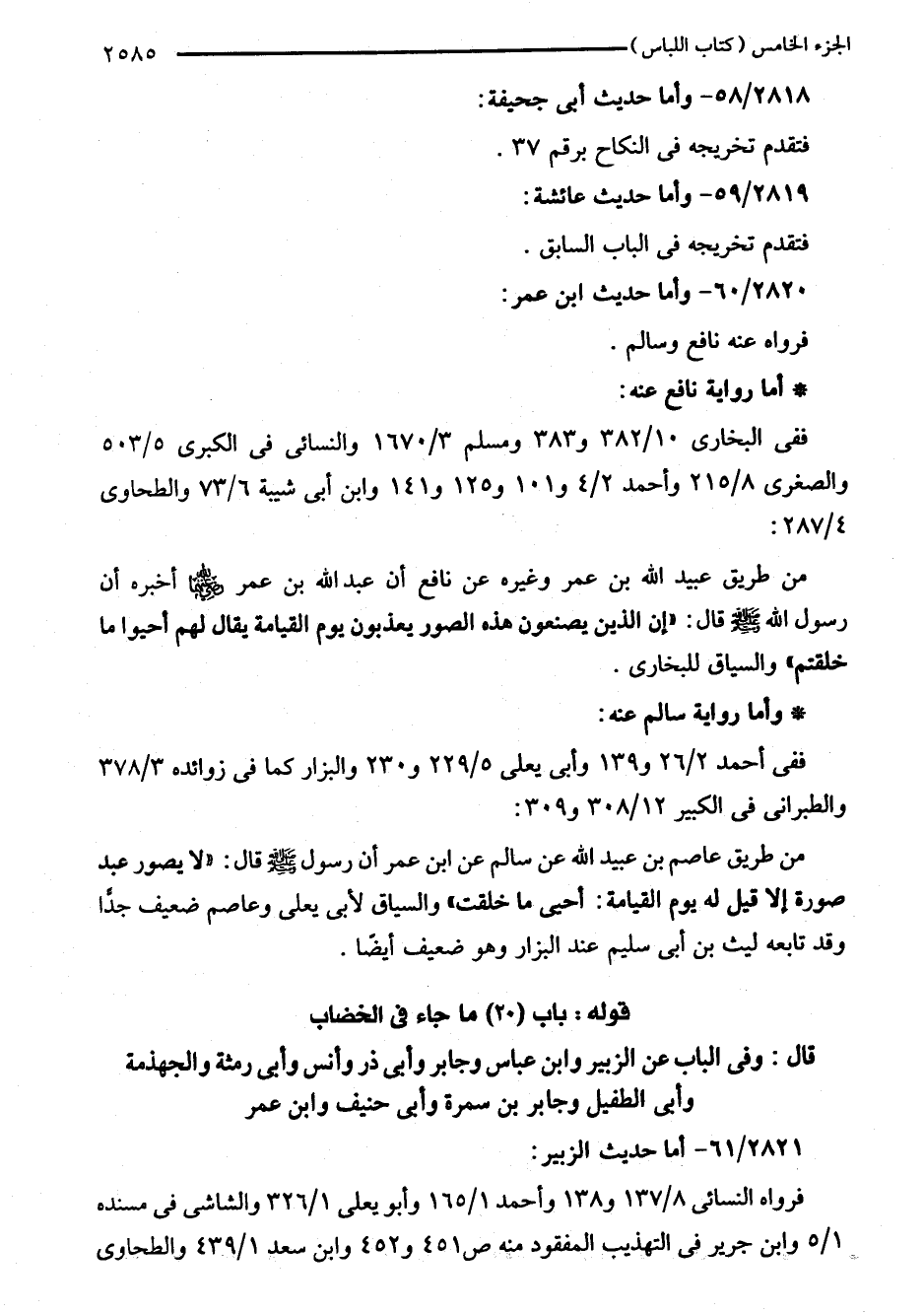 من طريق عبيد اللَّه بن عمر وغيره عن نافع أن عبد اللَّه بن عمر -رضي اللَّه عنهما- أخبره أن رسول اللَّه - صلى اللَّه عليه وسلم - قال: "إن الذين يصنعون هذه الصور يعذبون يوم القيامة يقال لهم أحيوا ما خلقتم" والسياق للبخاري.