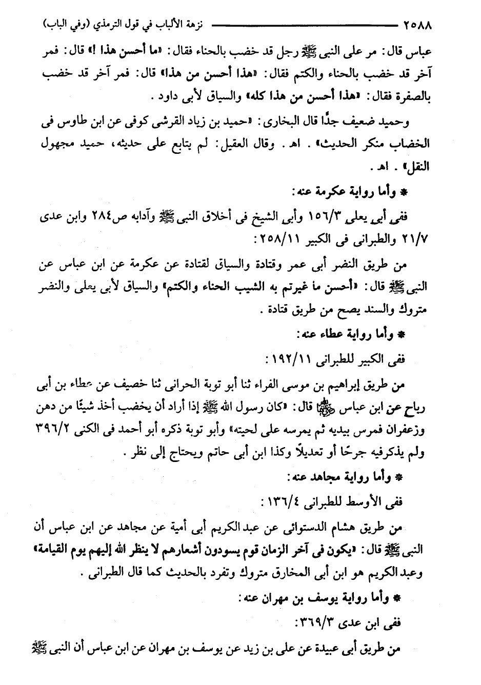 من طريق هشام الدستوائى عن عبد الكريم أبي أمية عن مجاهد عن ابن عباس أن النبي - صلى اللَّه عليه وسلم - قال: "يكون في آخر الزمان قوم يسودون أشعارهم لا ينظر اللَّه إليهم يوم القيامة" وعبد الكريم هو ابن أبي المخارق متروك وتفرد بالحديث كما قال الطبراني.