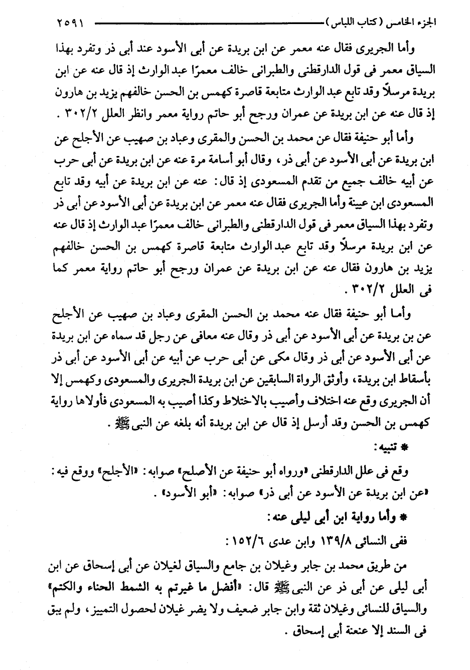 وأما أبو حنيفة فقال عنه محمد بن الحسن المقرى وعباد بن صهيب عن الأجلح عن بن بريدة عن أبي الأسود عن أبي ذر وقال عنه معافى عن رجل قد سماه عن ابن بريدة عن أبي الأسود عن أبي ذر وقال مكى عن أبي حرب عن أبيه عن أبي الأسود عن أبي ذر بإسقاط ابن بريدة، وأوثق الرواة السابقين عن ابن بريدة الجريرى والمسعودى وكهمس إلا أن الجريرى وقع عنه اختلاف وأصيب بالاختلاط وكذا أصيب به المسعودى فأولاها رواية كهمس بن الحسن وقد أرسل إذ قال عن ابن بريدة أنه بلغه عن النبي - صلى اللَّه عليه وسلم -.