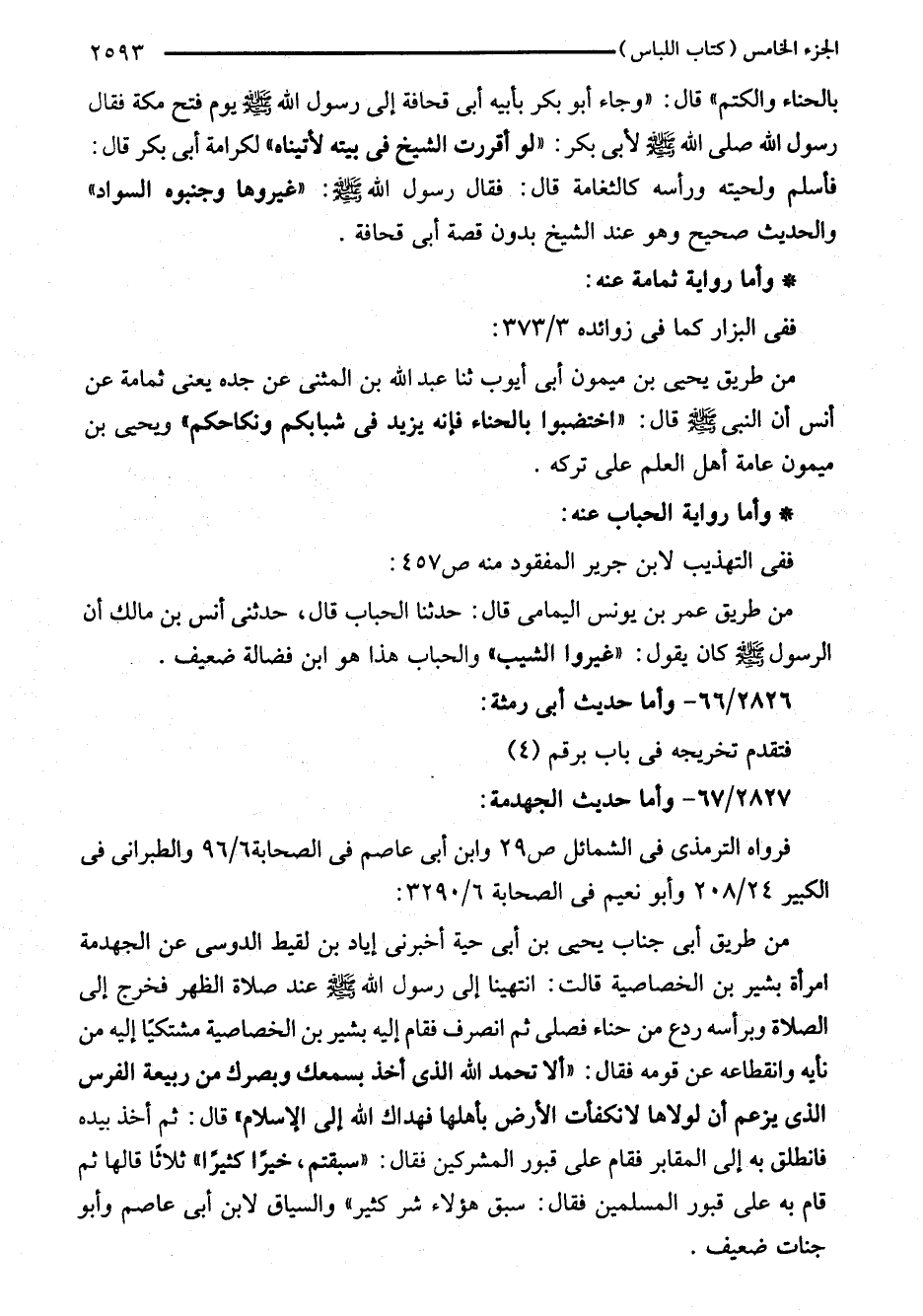 بالحناء والكتم" قال: "وجاء أبو بكر بأبيه أبي قحافة إلى رسول اللَّه - صلى اللَّه عليه وسلم - يوم فتح مكة فقال رسول اللَّه صلى اللَّه - صلى اللَّه عليه وسلم - لأبى بكر: "لو أقررت الشيخ في بيته لأتيناه" لكرامة أبي بكر قال: فأسلم ولحيته ورأسه كالثغامة قال: فقال رسول اللَّه - صلى اللَّه عليه وسلم -: "غيروها وجنبوه السواد" والحديث صحيح وهو عند الشيخ بدون قصة أبي قحافة.