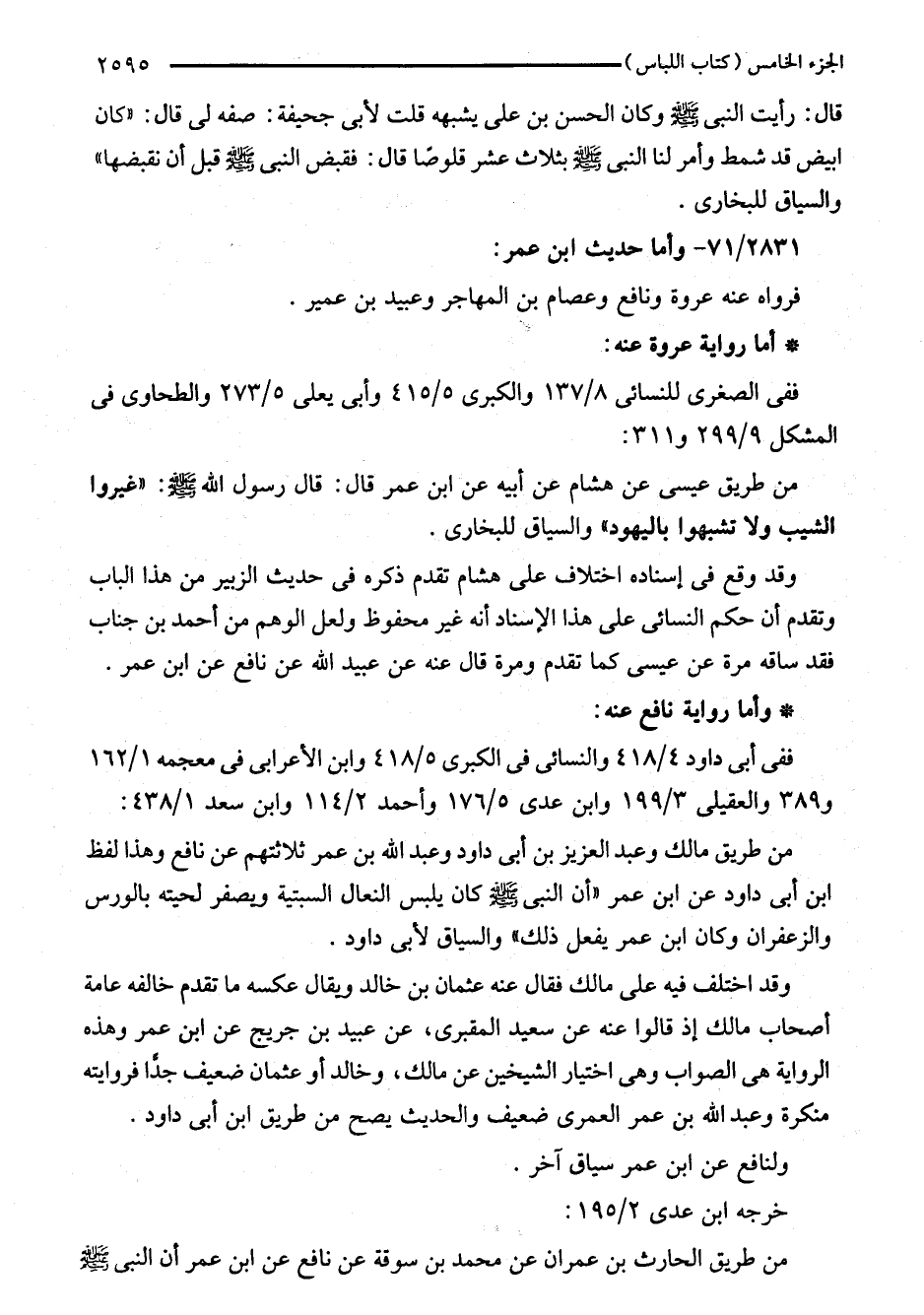 من طريق مالك وعبد العزيز بن أبي داود وعبد اللَّه بن عمر ثلاثتهم عن نافع وهذا لفظ ابن أبي داود عن ابن عمر "أن النبي - صلى اللَّه عليه وسلم - كان يلبس النعال السبتية ويصفر لحيته بالورس والزعفران وكان ابن عمر يفعل ذلك" والسياق لأبى داود.