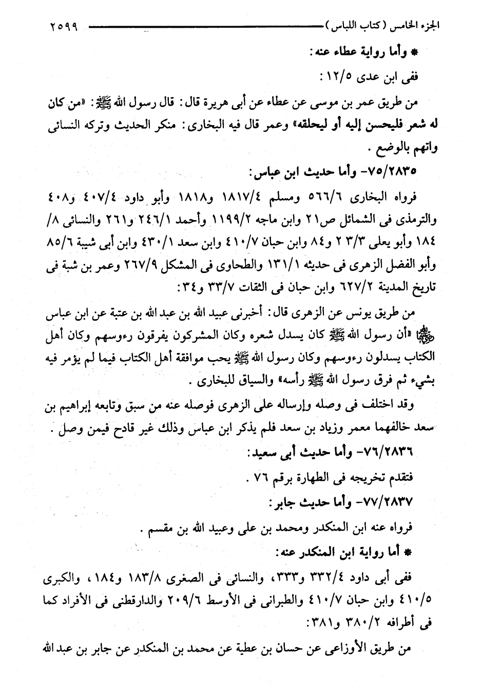 من طريق يونس عن الزهرى قال: أخبرنى عبيد اللَّه بن عبد اللَّه بن عتبة عن ابن عباس -رضي اللَّه عنهما- "أن رسول اللَّه - صلى اللَّه عليه وسلم - كان يسدل شعره وكان المشركون يفرقون رءوسهم وكان أهل الكتاب يسدلون رءوسهم وكان رسول اللَّه - صلى اللَّه عليه وسلم - يحب موافقة أهل الكتاب فيما لم يؤمر فيه بشيء ثم فرق رسول اللَّه - صلى اللَّه عليه وسلم - رأسه" والسياق للبخاري.