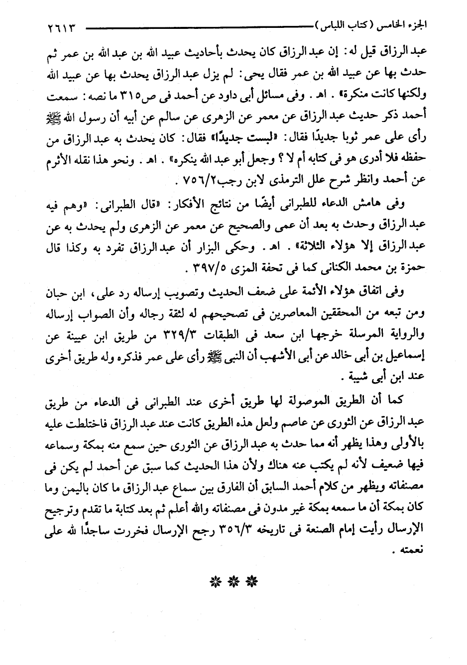 وفي هامش الدعاء للطبراني أيضًا من نتائج الأفكار: "قال الطبراني: "وهم فيه عبد الرزاق وحدث به بعد أن عمى والصحيح عن معمر عن الزهرى ولم يحدث به عن عبد الرزاق إلا هؤلاء الثلاثة". اهـ. وحكى البزار أن عبد الرزاق تفرد به وكذا قال حمزة بن محمد الكنانى كما في تحفة المزى 5/ 397.