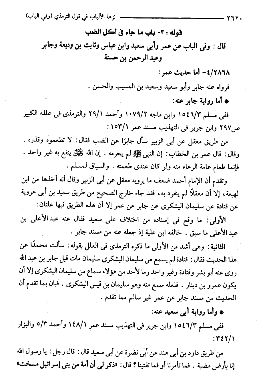 من طريق داود بن أبي هند عن أبي نضرة عن أبي سعيد قال: قال رجل: يا رسول اللَّه إنا بأرض مضبة. فما تأمرنا أو فما تفتينا؟ قال: "ذكر لى أن أمة من بنى إسرائيل مسخت"