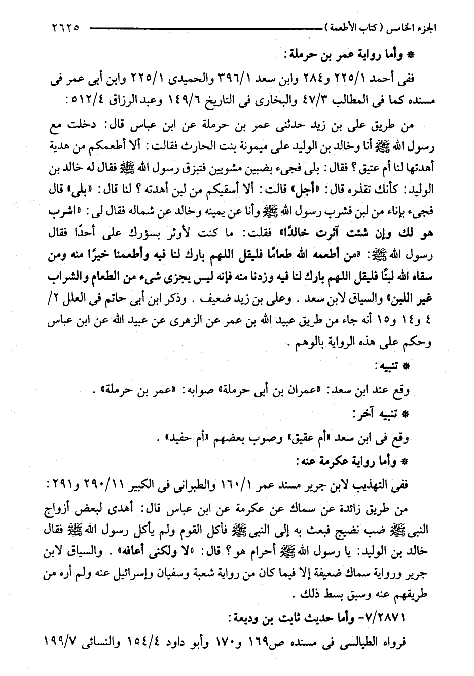 من طريق على بن زيد حدثنى عمر بن حرملة عن ابن عباس قال: دخلت مع رسول اللَّه - صلى اللَّه عليه وسلم - أنا وخالد بن الوليد على ميمونة بنت الحارث فقالت: ألا أطعمكم من هدية أهدتها لنا أم عتيق؟ فقال: بلى فجىء بضبين مشويين فتبزق رسول اللَّه - صلى اللَّه عليه وسلم - فقال له خالد بن الوليد: كأنك تقذره قال: "أجل" قالت: ألا أسقيكم من لبن أهدته؟ لنا قال: "بلى" قال فجىء بإناء من لبن فشرب رسول اللَّه - صلى اللَّه عليه وسلم - وأنا عن يمينه وخالد عن شماله فقال لى: "اشرب هو لك وإن شئث آثرت خالدًا" فقلت: ما كنت لأوثر بسؤرك على أحدًا فقال رسول اللَّه - صلى اللَّه عليه وسلم -: "من أطعمه اللَّه طعامًا فليقل اللهم بارك لنا فيه وأطعمنا خيرًا منه ومن سقاه اللَّه لبنًا فليقل اللهم بارك لنا فيه وزدنا منه فإنه ليس يجزى شىء من الطعام والشراب غير اللبن" والسياق لابن سعد. وعلى بن زيد ضعيف. وذكر ابن أبي حاتم في العلل 2/ 4 و 14 و 15 أنه جاء من طريق عبيد اللَّه بن عمر عن الزهرى عن عبيد اللَّه عن ابن عباس وحكم على هذه الرواية بالوهم.
