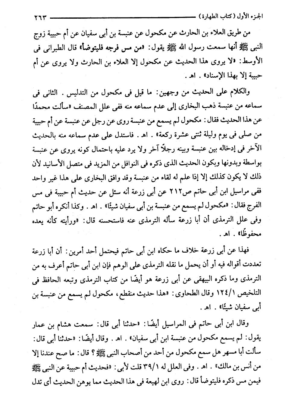 والكلام على الحديث من وجهين: ما قيل في مكحول من التدليس. الثانى في سماعه من عنبسة ذهب البخاري إلى عدم سماعه منه ففي علل المصنف "سألت محمدًا عن هذا الحديث فقال: مكحول لم يسمع من عنبسة روى عن رجل عن عنبسة عن أم حبيبة من صلى في يوم وليلة ثنتى عشرة ركعة". اهـ. فاستدل على عدم سماعه منه بالحديث الآخر في إدخاله بين عنبسة وبينه رجلًا آخر ولا يرد عليه باحتمال كونه يروى عن عنبسة بواسطة وبدونها وبكون الحديث الذى ذكره في النوافل من المزيد في متصل الأسانيد لأن ذلك لا يكون كذلك إلا إذا علم له لقاء من عنبسة وقد وافق البخاري على هذا غير واحد ففي مراسيل ابن أبى حاتم ص 212 عن أبى زرعة أنه سئل عن حديث أم حبيبة في مس الفرج فقال: "مكحول لم يسمع من عنبسة بن أبى سفيان شيئًا". اهـ. وكذا أنكره أبو حاتم وفى علل الترمذي أن أبا زرعة سأله الترمذي عنه فاستحسنه قال: "ورأيته كأنه يعده