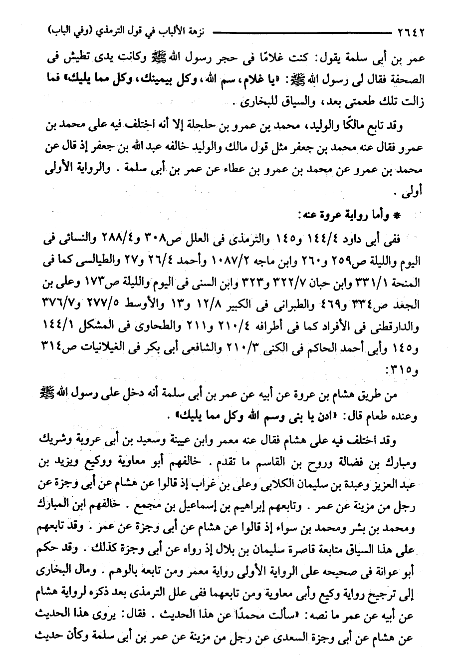 من طريق هشام بن عروة عن أبيه عن عمر بن أبي سلمة أنه دخل على رسول اللَّه - صلى اللَّه عليه وسلم - وعنده طعام قال: "ادن با بنى وسم اللَّه وكل مما يليك".