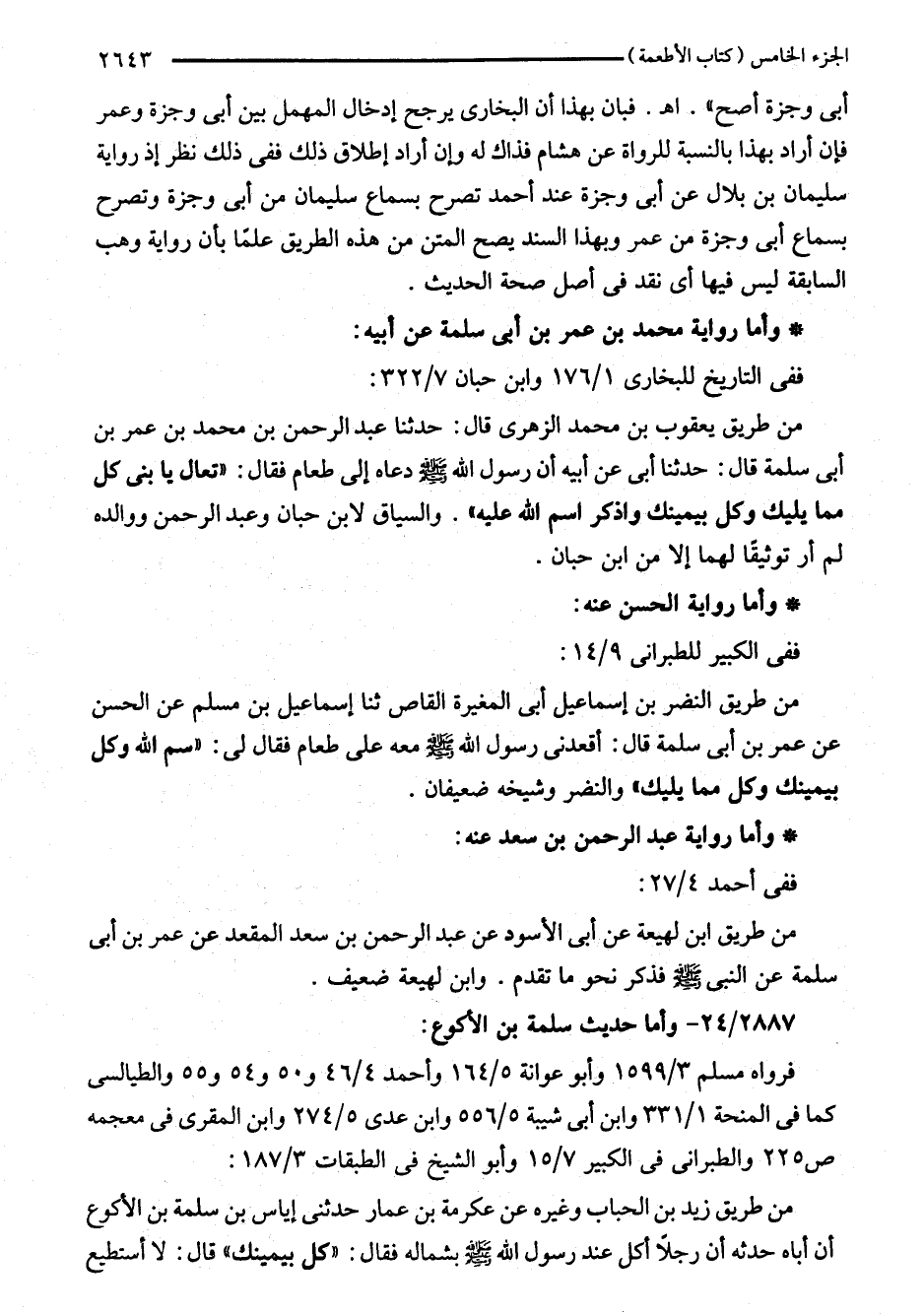 من طريق يعقوب بن محمد الزهرى قال: حدثنا عبد الرحمن بن محمد بن عمر بن أبي سلمة قال: حدثنا أبي عن أبيه أن رسول اللَّه - صلى اللَّه عليه وسلم - دعاه إلى طعام فقال: "تعال يا بنى كل مما يليك وكل بيمينك واذكر اسم اللَّه عليه". والسياق لابن حبان وعبد الرحمن ووالده لم أر توثيقًا إلا من ابن حبان.