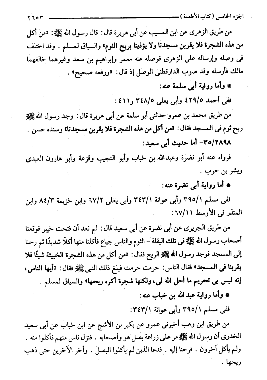 من طريق محمد بن عمرو حدثنى أبو سلمة عن أبي هريرة قال: وجد رسول اللَّه - صلى اللَّه عليه وسلم - ريح ثوم في المسجد فقال: "من أكل من هذه الشجرة فلا يقربن مسجدنا" وسنده حسن.