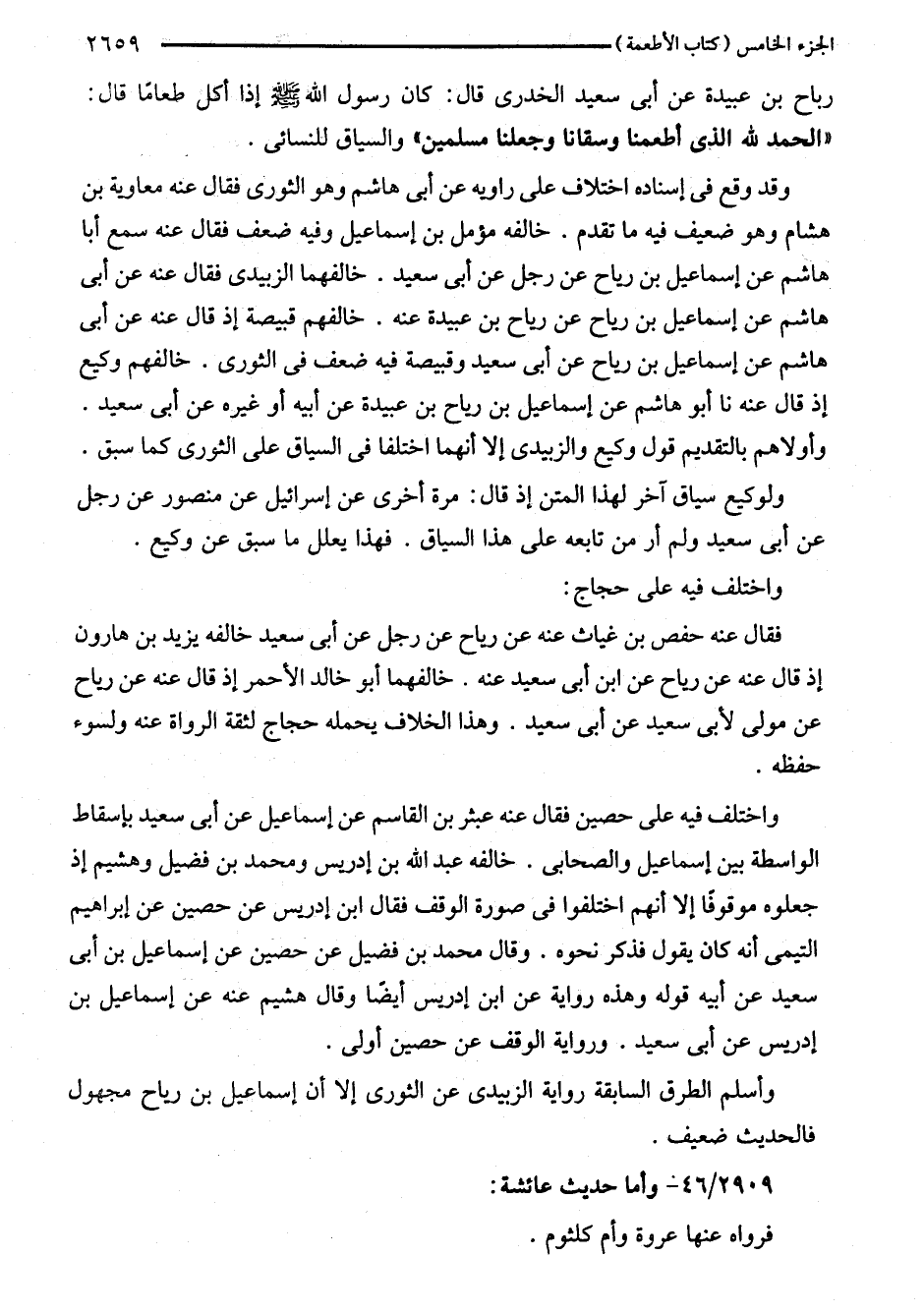 وقد وقع في إسناده اختلاف على راويه عن أبي هاشم وهو الثورى فقال عنه معاوية بن هشام وهو ضعيف فيه ما تقدم. خالفه مؤمل بن إسماعيل وفيه ضعف فقال عنه سمع أبا هاشم عن إسماعيل بن رياح عن رجل عن أبي سعيد. خالفهما الزبيدى فقال عنه عن أبي هاشم عن إسماعيل بن رياح عن رياح بن عبيدة عنه. خالفهم قبيصة إذ قال عنه عن أبي هاشم عن إسماعيل بن رياح عن أبي سعيد وقبيصة فيه ضعف في الثورى. خالفهم وكيع إذ قال عنه نا أبو هاشم عن إسماعيل بن رياح بن عبيدة عن أبيه أو غيره عن أبي سعيد. وأولاهم بالتقديم قول وكيع والزبيدى إلا أنهما اختلفا في السياق على الثورى كما سبق.