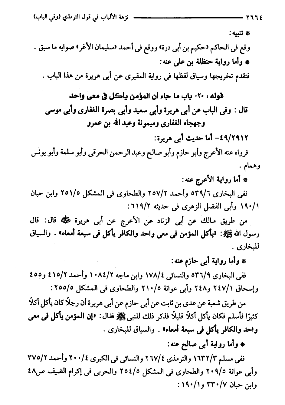 من طريق مالك عن أبي الزناد عن الأعرج عن أبي هريرة -رضي اللَّه عنه- قال: قال رسول اللَّه - صلى اللَّه عليه وسلم -: "يأكل المؤمن في معى واحد والكافر يأكل في سبعة أمعاء". والسياق للبخاري.