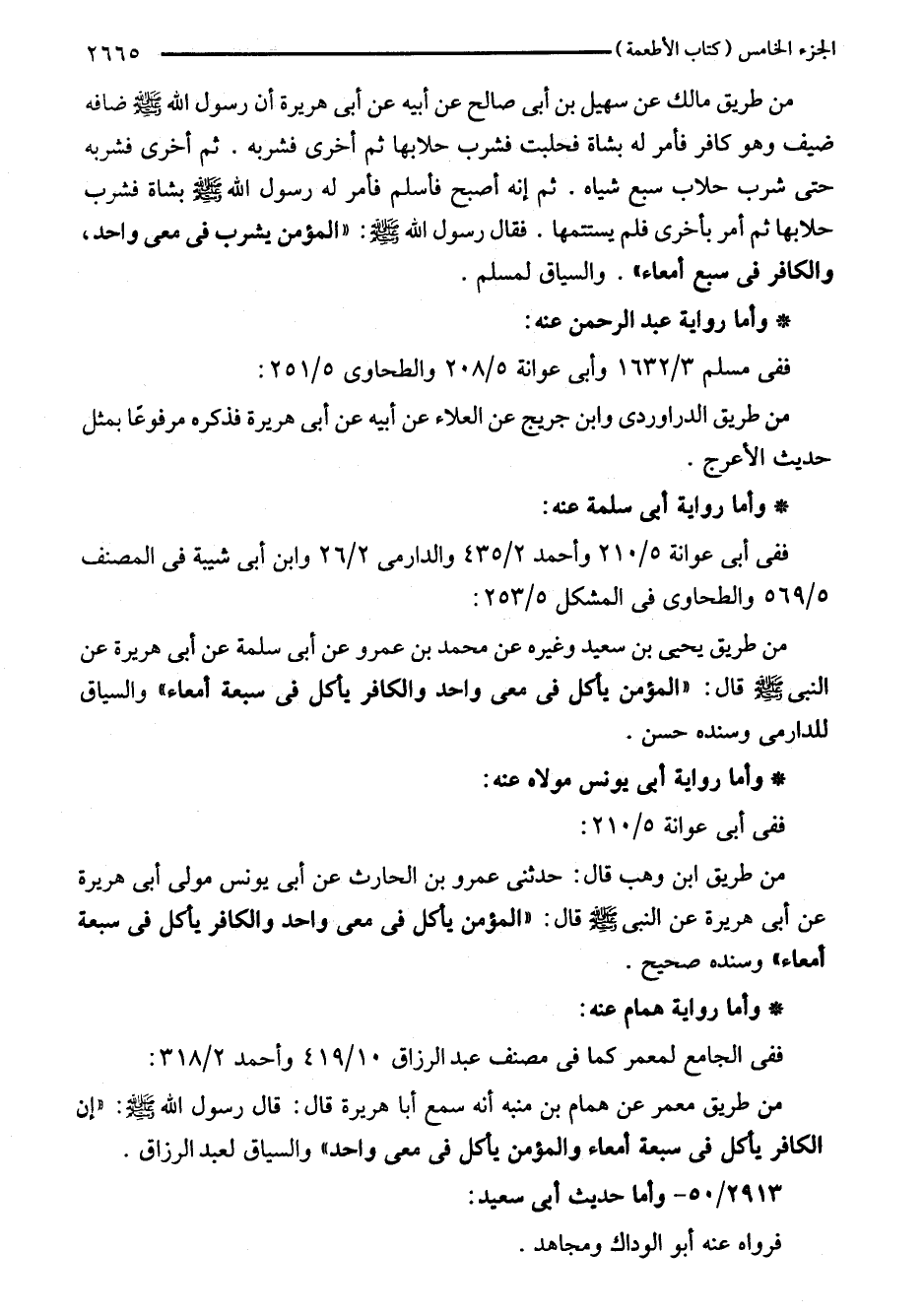 من طريق مالك عن سهيل بن أبي صالح عن أبيه عن أبي هريرة أن رسول اللَّه - صلى اللَّه عليه وسلم - ضافه ضيف وهو كافر فأمر له بشاة فحلبت فشرب حلابها ثم أخرى فشربه. ثم أخرى فشربه حتى شرب حلاب سبع شياه. ثم إنه أصبح فأسلم فأمر له رسول اللَّه - صلى اللَّه عليه وسلم - بشاة فشرب حلابها ثم أمر بأخرى فلم يستتمها. فقال رسول اللَّه - صلى اللَّه عليه وسلم -: "المؤمن يشرب في معى واحد، والكافر في سبع أمعاء". والسياق لمسلم.
