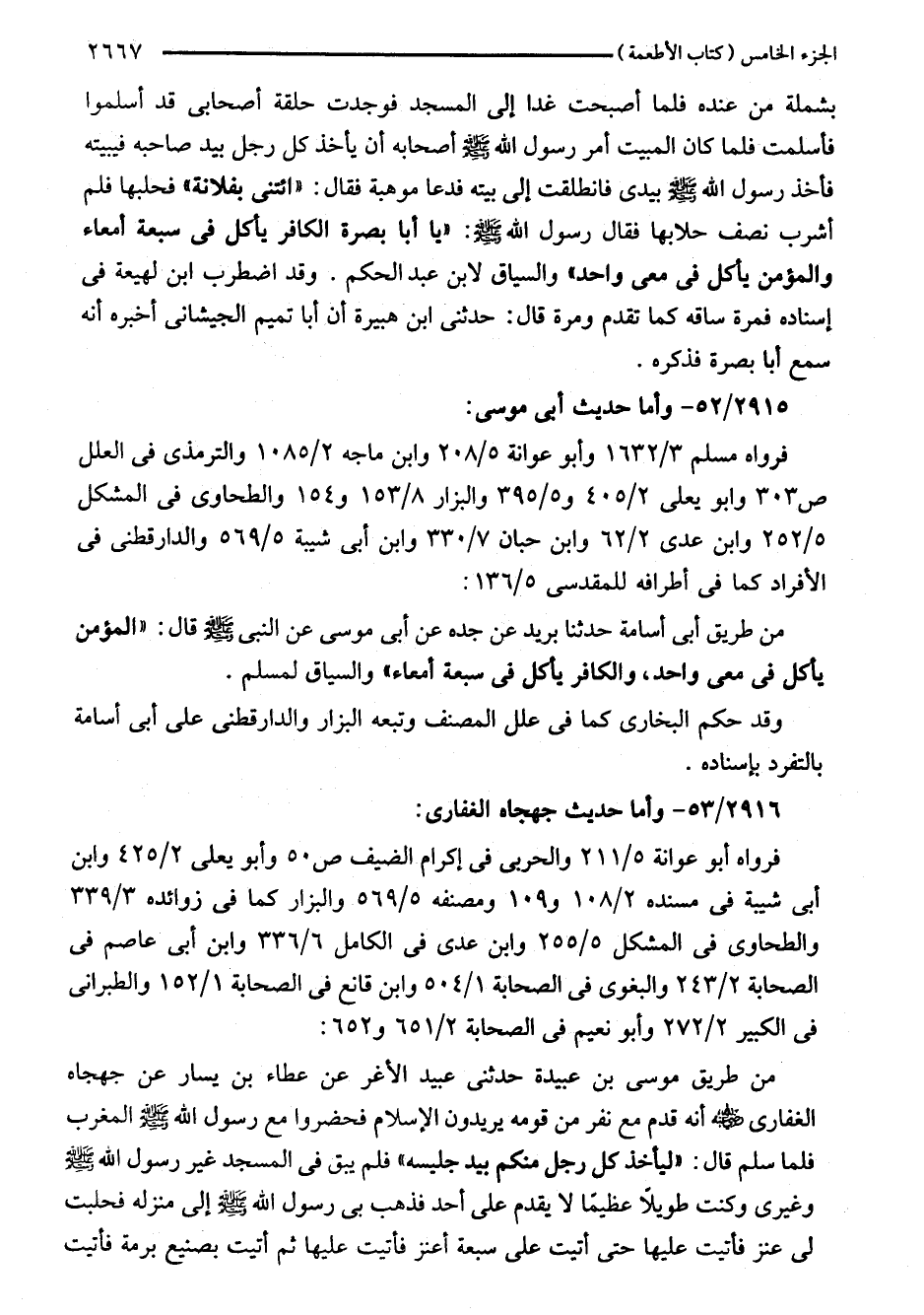 من طريق أبي أسامة حدثنا بريد عن جده عن أبي موسى عن النبي - صلى اللَّه عليه وسلم - قال: "المؤمن يأكل في معى واحد، والكافر يأكل في سبعة أمعاء" والسياق لمسلم.