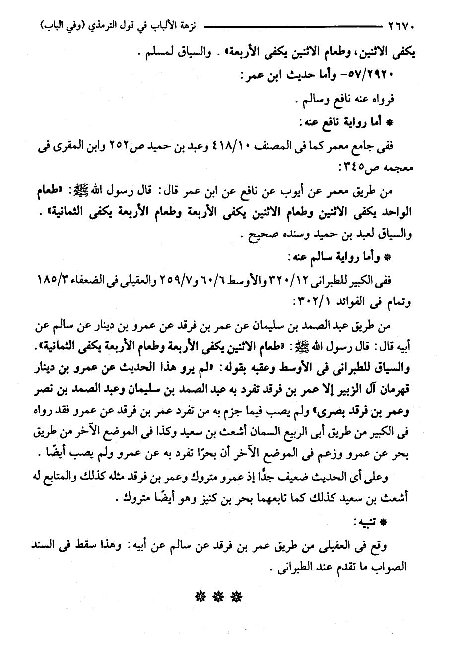 من طريق عبد الصمد بن سليمان عن عمر بن فرقد عن عمرو بن دينار عن سالم عن أبيه قال: قال رسول اللَّه - صلى اللَّه عليه وسلم -: "طعام الاثنين يكفى الأربعة وطعام الأربعة يكفى الثمانية". والسياق للطبراني في الأوسط وعقبه بقوله: "لم يرو هذا الحديث عن عمرو بن دينار قهرمان آل الزبير إلا عمر بن فرقد تفرد به عبد الصمد بن سليمان وعبد الصمد بن نصر وعمر بن فرقد بصرى" ولم يصب فيما جزم به من تفرد عمر بن فرقد عن عمرو فقد رواه في الكبير من طريق أبي الربيع السمان أشعث بن سعيد وكذا في الموضع الآخر من طريق بحر عن عمرو وزعم في الموضع الآخر أن بحرًا تفرد به عن عمرو ولم يصب أيضًا.