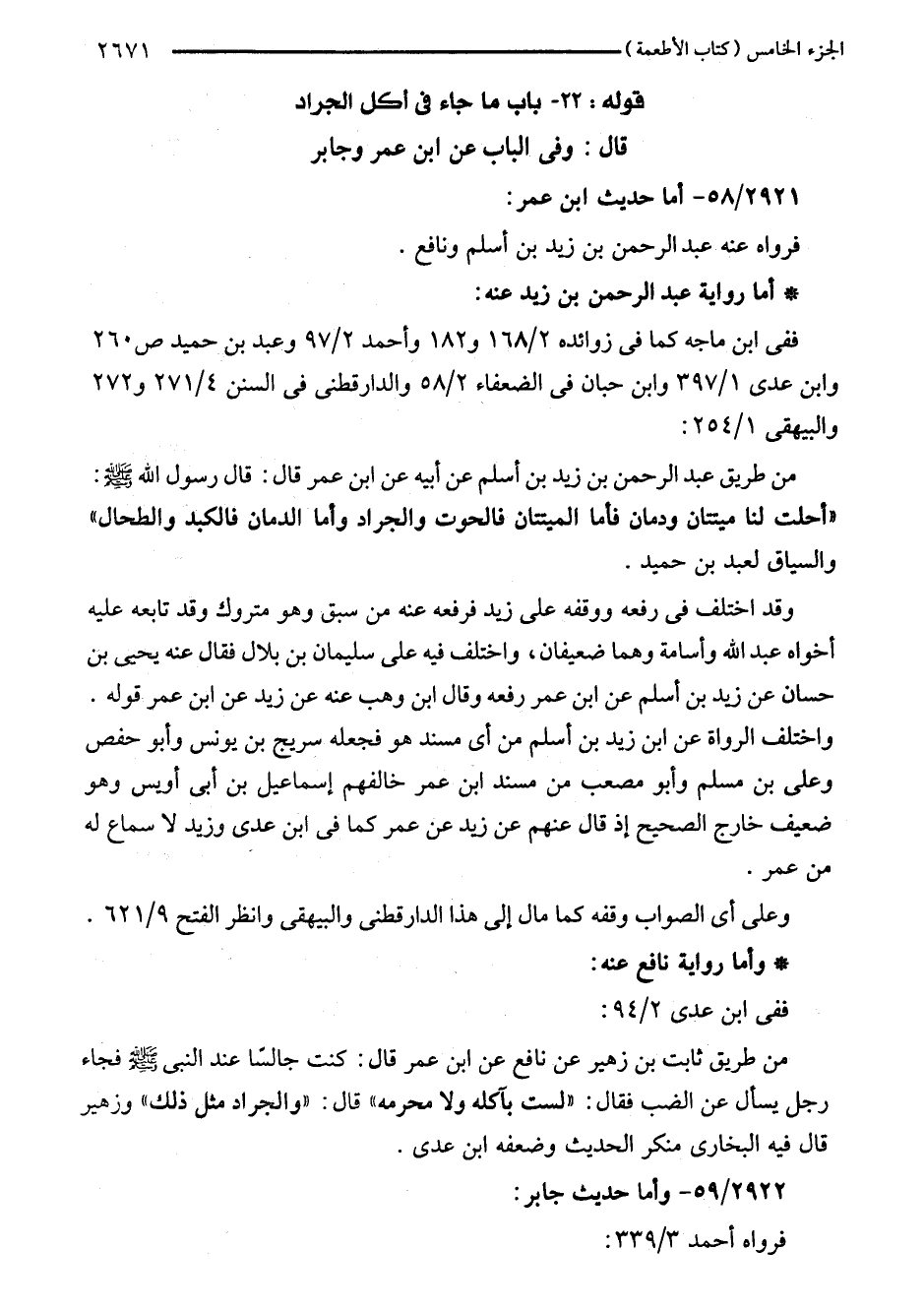 من طريق ثابت بن زهير عن نافع عن ابن عمر قال: كنت جالسًا عند النبي - صلى اللَّه عليه وسلم - فجاء رجل يسأل عن الضب فقال: "لست بآكله ولا محرمه" قال: "والجراد مثل ذلك" وزهير قال فيه البخاري منكر الحديث وضعفه ابن عدى.