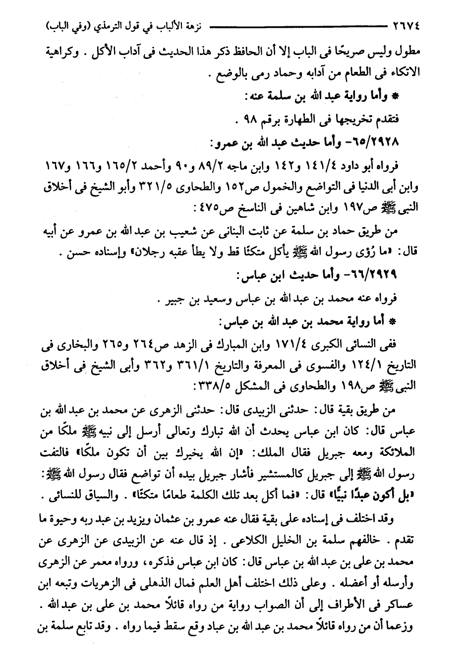 من طريق بقية قال: حدثنى الزبيدى قال: حدثنى الزهرى عن محمد بن عبد اللَّه بن عباس قال: كان ابن عباس يحدث أن اللَّه تبارك وتعالى أرسل إلى نبيه - صلى اللَّه عليه وسلم - ملكًا من الملائكة ومعه جبريل فقال الملك: "إن اللَّه يخيرك بين أن تكون ملكًا" فالتفت رسول اللَّه - صلى اللَّه عليه وسلم - إلى جبريل كالمستشير فأشار جبريل بيده أن تواضع فقال رسول اللَّه - صلى اللَّه عليه وسلم -: "بل أكون عبدًا نبيًّا" قال: "فما أكل بعد تلك الكلمة طعامًا متكئًا". والسياق للنسائي.