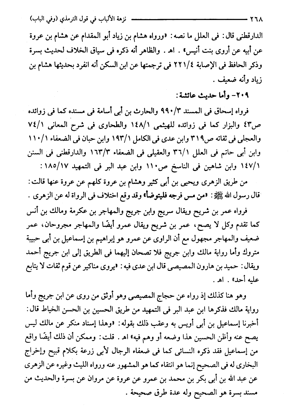 الدارقطني قال: في العلل ما نصه: "ورواه هشام بن زياد أبو المقدام عن هشام بن عروة عن أبيه عن أروى بنت أنيس". اهـ. والظاهر أنه ذكره في سياق الخلاف لحديث بسرة وذكر الحافظ في الإصابة 4/ 221 في ترجمتها عن ابن السكن أنه انفرد بحديثها هشام بن زياد وأنه ضعيف.