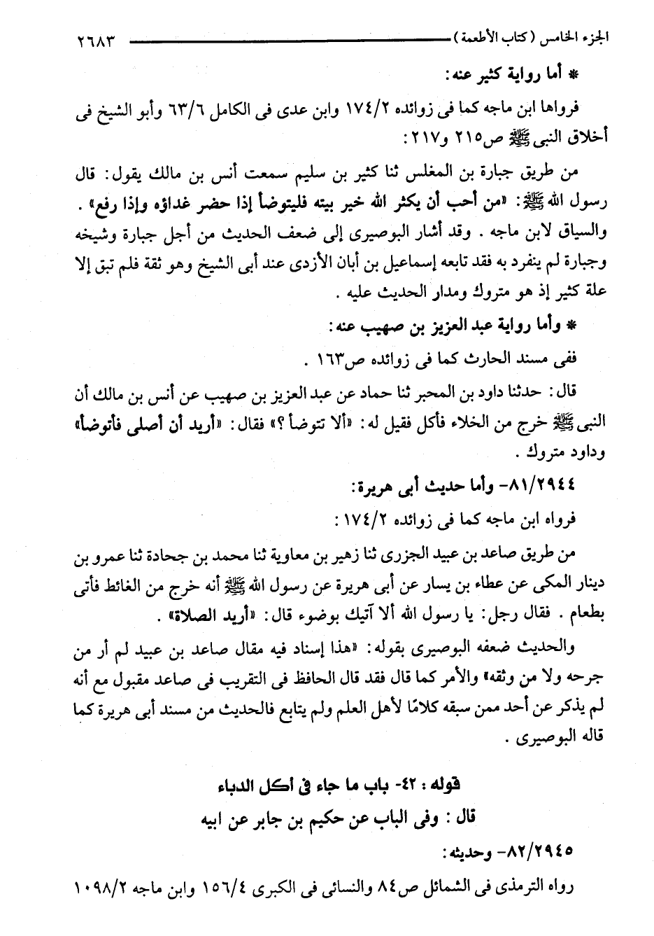 من طريق جبارة بن المغلس ثنا كثير بن سليم سمعت أنس بن مالك يقول: قال رسول اللَّه - صلى اللَّه عليه وسلم -: "من أحب أن يكثر اللَّه خير بيته فليتوضأ إذا حضر غداؤه وإذا رفع". والسياق لابن ماجه. وقد أشار البوصيرى إلى ضعف الحديث من أجل جبارة وشيخه وجبارة لم ينفرد به فقد تابعه إسماعيل بن أبان الأزدى عند أبي الشيخ وهو ثقة فلم تبق إلا علة كثير إذ هو متروك ومدار الحديث عليه.