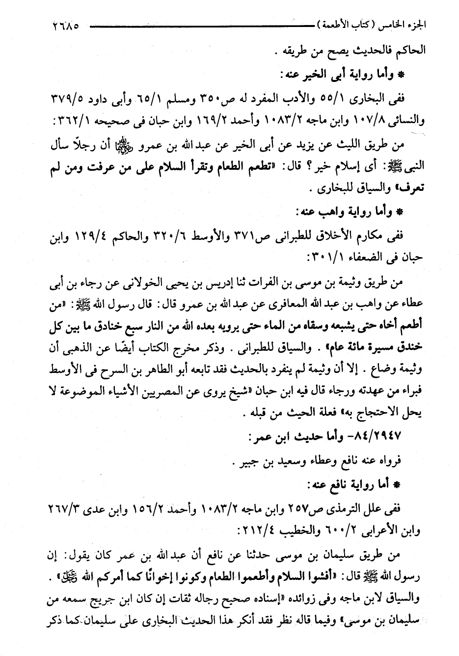 من طريق الليث عن يزيد عن أبي الخير عن عبد اللَّه بن عمرو -رضي اللَّه عنهما- رجلًا سأل النبي - صلى اللَّه عليه وسلم -: أي إسلام خير؟ قال: "تطعم الطعام وتقرأ السلام على من عرفت ومن لم تعرف" والسياق للبخاري.