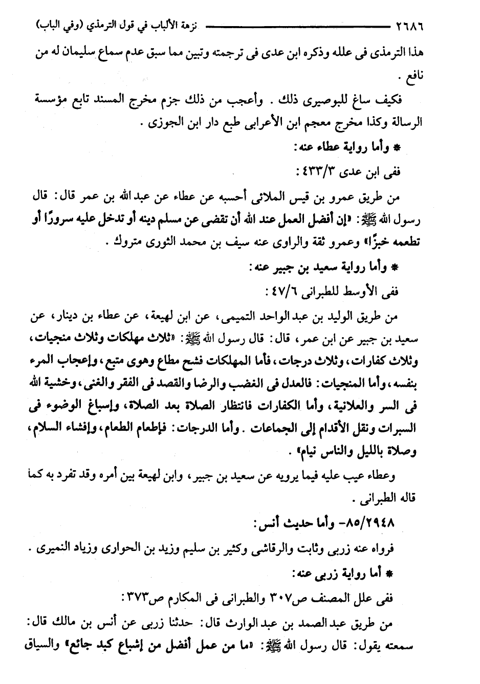 من طريق الوليد بن عبد الواحد التميمى، عن ابن لهيعة، عن عطاء بن دينار، عن سعيد بن جبير عن ابن عمر، قال: قال رسول اللَّه - صلى اللَّه عليه وسلم -: "ثلاث مهلكات وثلاث منجيات، وثلاث كفارات، وثلاث درجات، فأما المهلكات فشح مطاع وهوى متبع، وإعجاب المرء بنفسه، وأما المنجيات: فالعدل في الغضب والرضا والقصد في الفقر والغنى، وخشية اللَّه في السر والعلانية، وأما الكفارات فانتظار الصلاة بعد الصلاة وإسباغ الوضوء في السبرات ونقل الأقدام إلى الجماعات. وأما الدرجات: فإطعام الطعام، وإفشاء السلام، وصلاة بالليل والناس نيام".