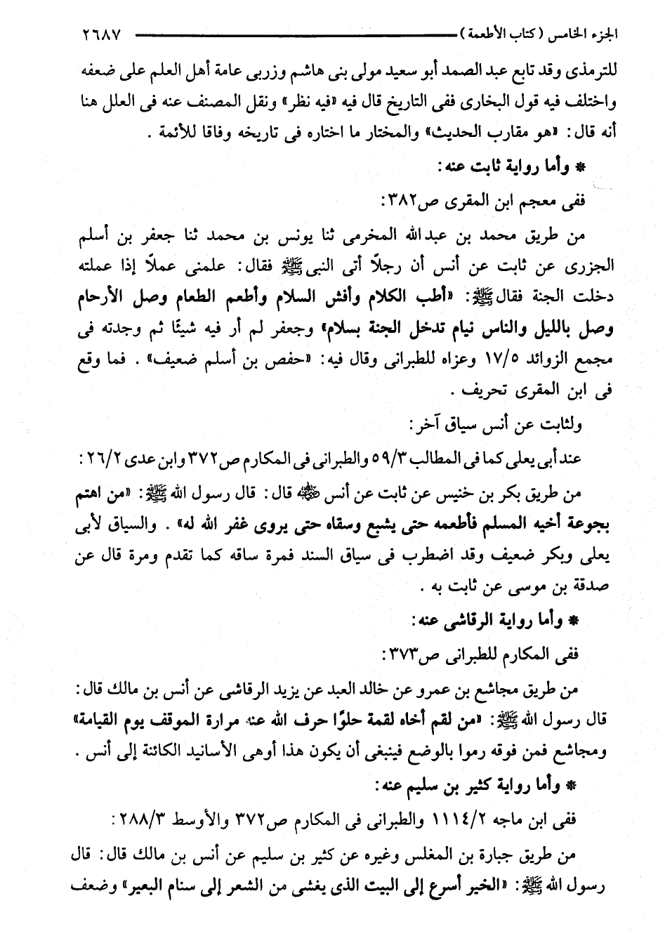 من طريق مجاشع بن عمرو عن خالد العبد عن يزيد الرقاشى عن أنس بن مالك قال: قال رسول اللَّه - صلى اللَّه عليه وسلم -: "من لقم أخاه لقمة حلوًا حرف اللَّه عنه مرارة الموقف يوم القيامة" ومجاشع فمن فوقه رموا بالوضع فينبغى أن يكون هذا أوهى الأسانيد الكائنة إلى أنس.