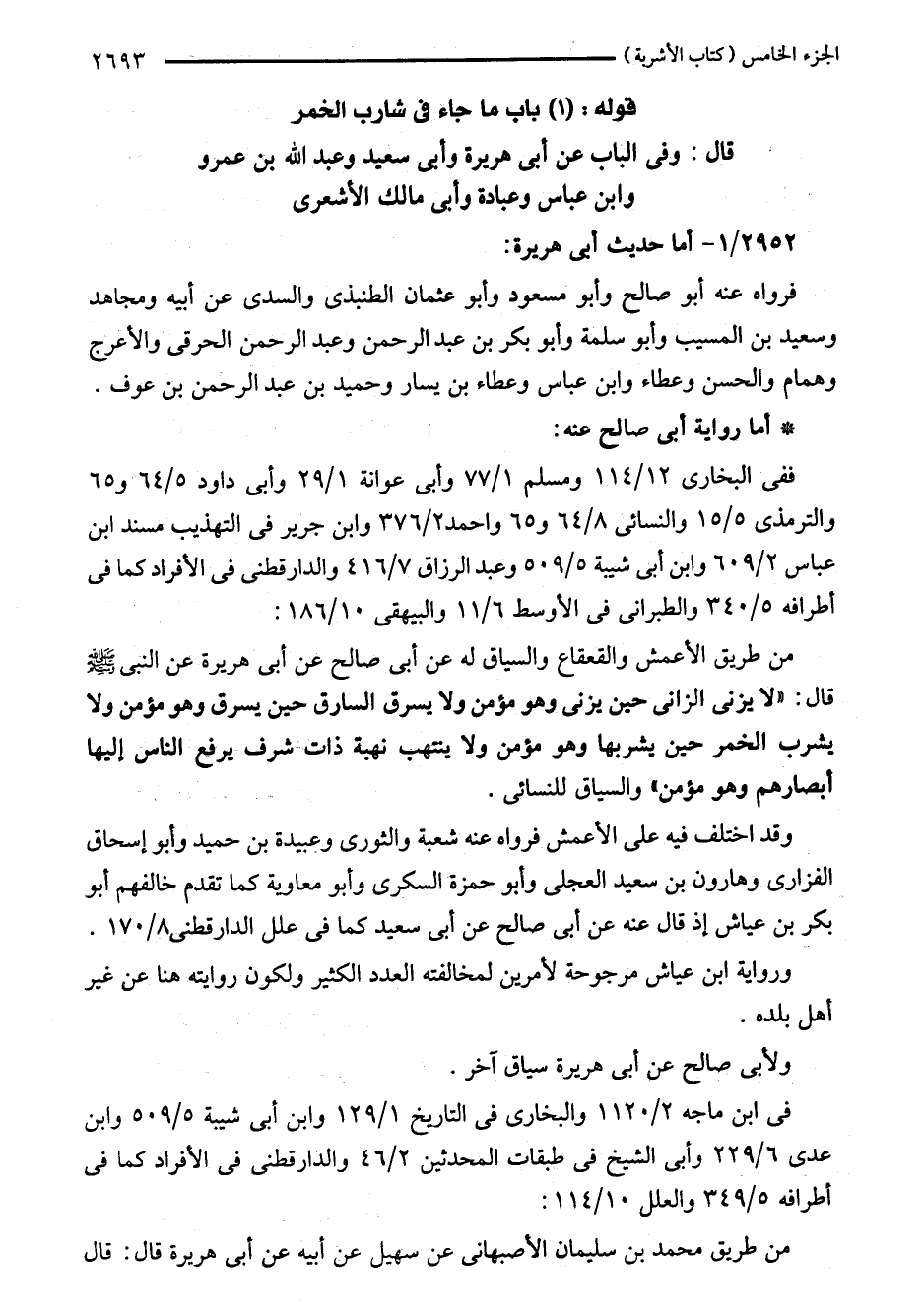 من طريق الأعمش والقعقاع والسياق له عن أبي صالح عن أبي هريرة عن النبي - صلى اللَّه عليه وسلم - قال: "لا يزنى الزانى حين يزنى وهو مؤمن ولا يسرق السارق حين يسرق وهو مؤمن ولا يشرب الخمر حين يشربها وهو مؤمن ولا بنتهب نهبة ذات شرف يرفع الناس إليها أبصارهم وهو مؤمن" والسياق للنسائي.
