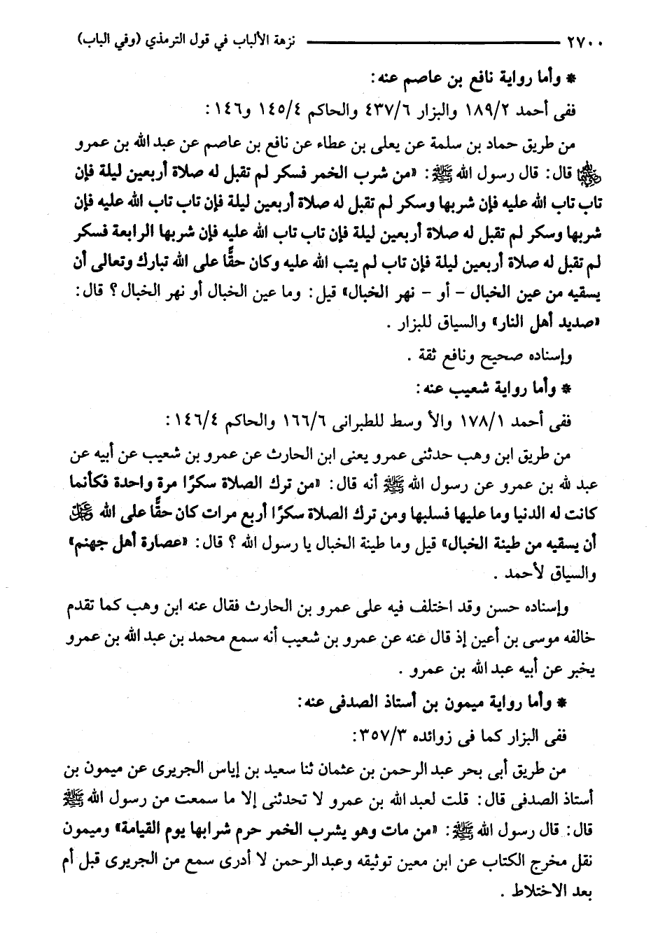 من طريق حماد بن سلمة عن يعلى بن عطاء عن نافع بن عاصم عن عبد اللَّه بن عمرو -رضي اللَّه عنهما- قال: قال رسول اللَّه - صلى اللَّه عليه وسلم -: "من شرب الخمر فسكر لم تقبل له صلاة أربعين ليلة فإن تاب تاب اللَّه عليه فإن شربها وسكر لم تقبل له صلاة أربعين ليلة فإن تاب تاب اللَّه عليه فإن شربها وسكر لم تقبل له صلاة أربعين ليلة فإن تاب تاب اللَّه عليه فإن شربها الرابعة فسكر لم تقبل له صلاة أربعين ليلة فإن تاب لم يتب اللَّه عليه وكان حقًا على اللَّه تبارك وتعالى أن يسقيه من عين الخبال -أو- نهر الخبال" قيل: وما عين الخبال أو نهر الخبال؟ قال: "صديد أهل النار" والسياق للبزار.