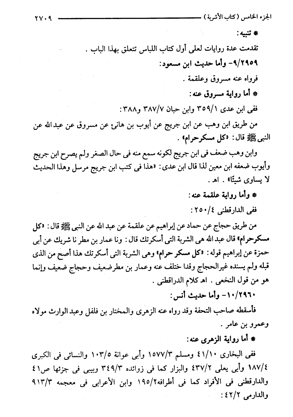 من طريق حجاج عن حماد عن إبراهيم عن علقمة عن عبد اللَّه عن النبي - صلى اللَّه عليه وسلم - قال: "كل مسكر حرام" قال عبد اللَّه هي الشربة التى أسكرتك قال: ونا عمار بن مطر نا شريك عن أبي حمزة عن إبراهيم قوله: "كل مسكر حرام" وهى الشربة التى أسكرتك هذا أصح من الذى قبله ولم يسنده غير الحجاج وقدا ختلف عنه وعمار بن مطر ضعيف وحجاج ضعيف وإنما هو من قول النخعى. اهـ كلام الدراقطنى.